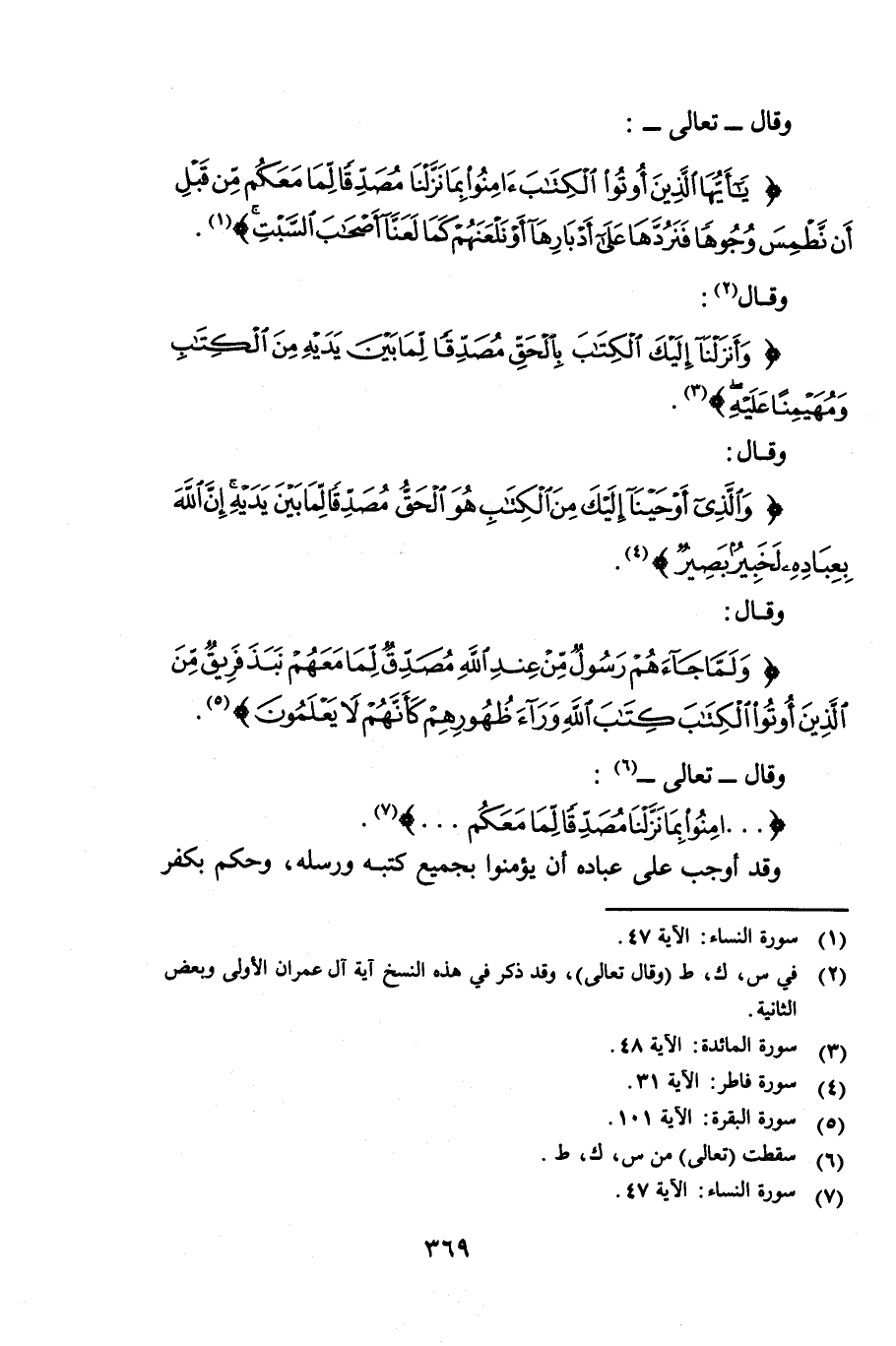 وَقَالَ - تَعَالَى -: {يَاأَيُّهَا الَّذِينَ أُوتُوا الْكِتَابَ آمِنُوا بِمَا نَزَّلْنَا مُصَدِّقًا لِمَا مَعَكُمْ مِنْ قَبْلِ أَنْ نَطْمِسَ وُجُوهًا فَنَرُدَّهَا عَلَى أَدْبَارِهَا أَوْ نَلْعَنَهُمْ كَمَا لَعَنَّا أَصْحَابَ السَّبْتِ} [النساء: 47] وَقَالَ: {وَأَنْزَلْنَا إِلَيْكَ الْكِتَابَ بِالْحَقِّ مُصَدِّقًا لِمَا بَيْنَ يَدَيْهِ مِنَ الْكِتَابِ وَمُهَيْمِنًا عَلَيْهِ} [المائدة: 48] وَقَالَ: {وَالَّذِي أَوْحَيْنَا إِلَيْكَ مِنَ الْكِتَابِ هُوَ الْحَقُّ مُصَدِّقًا لِمَا بَيْنَ يَدَيْهِ إِنَّ اللَّهَ بِعِبَادِهِ لَخَبِيرٌ بَصِيرٌ} [فاطر: 31] وَقَالَ: {وَلَمَّا جَاءَهُمْ رَسُولٌ مِنْ عِنْدِ اللَّهِ مُصَدِّقٌ لِمَا مَعَهُمْ نَبَذَ فَرِيقٌ مِنَ الَّذِينَ أُوتُوا الْكِتَابَ كِتَابَ اللَّهِ وَرَاءَ ظُهُورِهِمْ كَأَنَّهُمْ لَا يَعْلَمُونَ} [البقرة: 101] وَقَالَ - تَعَالَى -: {آمِنُوا بِمَا نَزَّلْنَا مُصَدِّقًا لِمَا مَعَكُمْ} [النساء: 47] وَقَدْ أَوْجَبَ عَلَى عِبَادِهِ أَنْ يُؤْمِنُوا بِجَمِيعِ كُتُبِهِ وَرُسُلِهِ وَحَكَمَ بِكُفْرِ