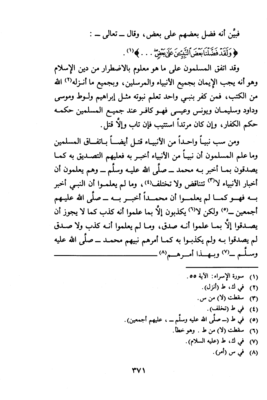 فَبَيَّنَ أَنَّهُ فَضَّلَ بَعْضَهُمْ عَلَى بَعْضٍ وَقَالَ - تَعَالَى -: {وَلَقَدْ فَضَّلْنَا بَعْضَ النَّبِيِّينَ عَلَى بَعْضٍ} [الإسراء: 55] وَقَدِ اتَّفَقَ الْمُسْلِمُونَ عَلَى مَا هُوَ مَعْلُومٌ بِالِاضْطِرَارِ مِنْ دِينِ الْإِسْلَامِ وَهُوَ أَنَّهُ يَجِبُ الْإِيمَانُ بِجَمِيعِ الْأَنْبِيَاءِ وَالْمُرْسَلِينَ وَبِجَمِيعِ مَا أَنْزَلَهُ اللَّهُ مِنَ الْكُتُبِ فَمَنْ كَفَرَ بِنَبِيٍّ وَاحِدٍ تُعْلَمُ نُبُوَّتُهُ مِثْلُ إِبْرَاهِيمَ وَلُوطٍ وَمُوسَى وَدَاوُدَ وَسُلَيْمَانَ وَيُونُسَ وَعِيسَى فَهُوَ كَافِرٌ عِنْدَ جَمِيعِ الْمُسْلِمِينَ حُكْمُهُ حُكْمُ الْكُفَّارِ وَإِنْ كَانَ مُرْتَدًّا اسْتُتِيبَ، فَإِنْ تَابَ وَإِلَّا قُتِلَ.