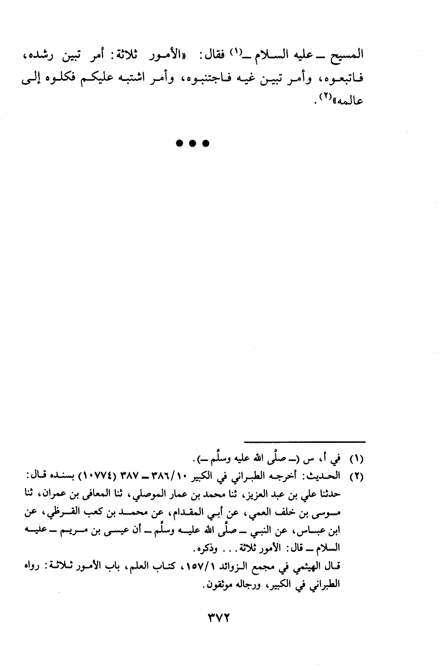 الْمَسِيحُ - عَلَيْهِ السَّلَامُ - فَقَالَ: الْأُمُورُ ثَلَاثَةٌ أَمْرٌ تَبَيَّنَ رُشْدُهُ فَاتَّبِعُوهُ وَأَمْرٌ تَبَيَّنَ غَيُّهُ فَاجْتَنِبُوهُ وَأَمْرٌ اشْتَبَهَ عَلَيْكُمْ فَكِلُوهُ إِلَى عَالِمِهِ.