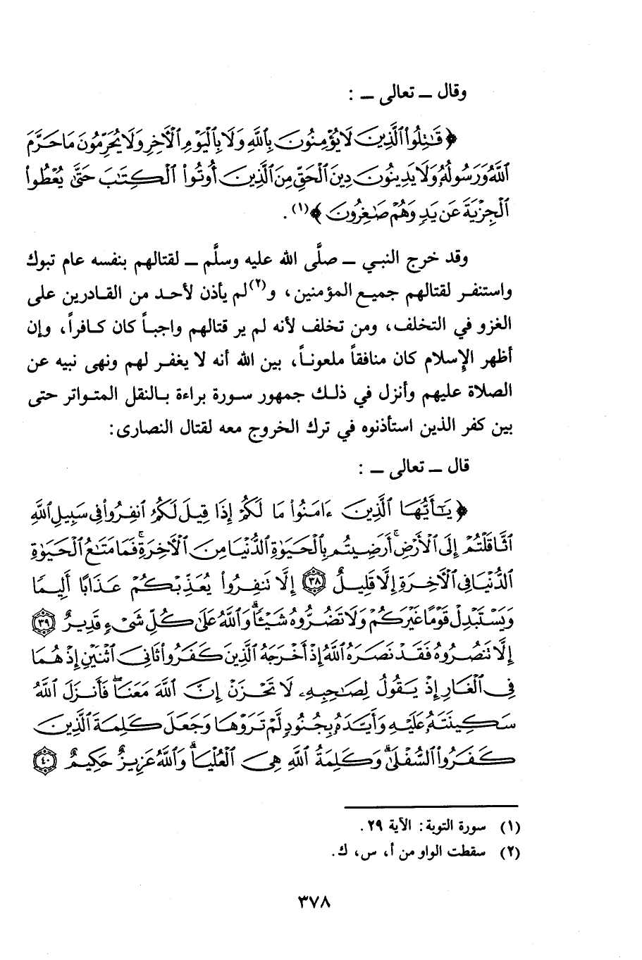 وَقَالَ - تَعَالَى -: {قَاتِلُوا الَّذِينَ لَا يُؤْمِنُونَ بِاللَّهِ وَلَا بِالْيَوْمِ الْآخِرِ وَلَا يُحَرِّمُونَ مَا حَرَّمَ اللَّهُ وَرَسُولُهُ وَلَا يَدِينُونَ دِينَ الْحَقِّ مِنَ الَّذِينَ أُوتُوا الْكِتَابَ حَتَّى يُعْطُوا الْجِزْيَةَ عَنْ يَدٍ وَهُمْ صَاغِرُونَ} [التوبة: 29] وَقَدْ خَرَجَ النَّبِيُّ - صَلَّى اللَّهُ عَلَيْهِ وَسَلَّمَ - لِقِتَالِهِمْ بِنَفْسِهِ عَامَ تَبُوكَ وَاسْتَنْفَرَ لِقِتَالِهِمْ جَمِيعَ الْمُؤْمِنِينَ وَلَمْ يَأْذَنْ لِأَحَدٍ مِنَ الْقَادِرِينَ عَلَى الْغَزْوِ فِي التَّخَلُّفِ وَمَنْ تَخَلَّفَ لِأَنَّهُ لَمْ يَرَ قِتَالَهُمْ وَاجِبًا كَانَ كَافِرًا وَإِنْ أَظْهَرَ الْإِسْلَامَ كَانَ مُنَافِقًا مَلْعُونًا بَيَّنَ اللَّهُ أَنَّهُ لَا يَغْفِرُ لَهُمْ وَنَهَى نَبِيَّهُ عَنِ الصَّلَاةِ عَلَيْهِمْ وَأَنْزَلَ فِي ذَلِكَ جُمْهُورَ سُورَةِ بَرَاءَةَ بِالنَّقْلِ الْمُتَوَاتِرِ حَتَّى بَيَّنَ كُفْرَ الَّذِينَ اسْتَأْذَنُوهُ فِي تَرْكِ الْخُرُوجِ مَعَهُ لِقِتَالِ النَّصَارَى.
