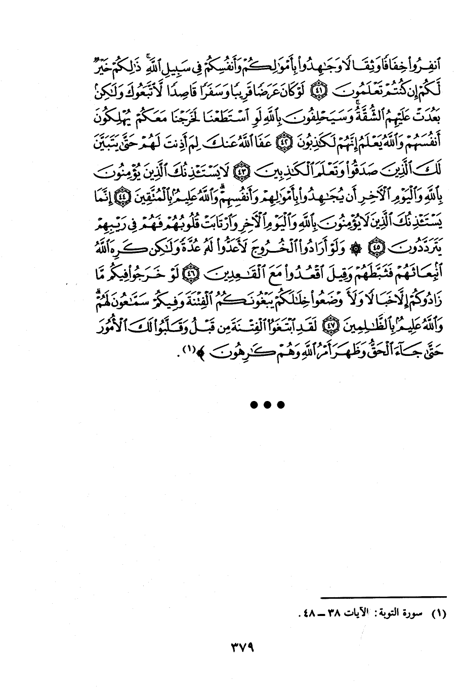 {يَاأَيُّهَا الَّذِينَ آمَنُوا مَا لَكُمْ إِذَا قِيلَ لَكُمُ انْفِرُوا فِي سَبِيلِ اللَّهِ اثَّاقَلْتُمْ إِلَى الْأَرْضِ أَرَضِيتُمْ بِالْحَيَاةِ الدُّنْيَا مِنَ الْآخِرَةِ فَمَا مَتَاعُ الْحَيَاةِ الدُّنْيَا فِي الْآخِرَةِ إِلَّا قَلِيلٌ - إِلَّا تَنْفِرُوا يُعَذِّبْكُمْ عَذَابًا أَلِيمًا وَيَسْتَبْدِلْ قَوْمًا غَيْرَكُمْ وَلَا تَضُرُّوهُ شَيْئًا وَاللَّهُ عَلَى كُلِّ شَيْءٍ قَدِيرٌ - إِلَّا تَنْصُرُوهُ فَقَدْ نَصَرَهُ اللَّهُ إِذْ أَخْرَجَهُ الَّذِينَ كَفَرُوا ثَانِيَ اثْنَيْنِ إِذْ هُمَا فِي الْغَارِ إِذْ يَقُولُ لِصَاحِبِهِ لَا تَحْزَنْ إِنَّ اللَّهَ مَعَنَا فَأَنْزَلَ اللَّهُ سَكِينَتَهُ عَلَيْهِ وَأَيَّدَهُ بِجُنُودٍ لَمْ تَرَوْهَا وَجَعَلَ كَلِمَةَ الَّذِينَ كَفَرُوا السُّفْلَى وَكَلِمَةُ اللَّهِ هِيَ الْعُلْيَا وَاللَّهُ عَزِيزٌ حَكِيمٌ - انْفِرُوا خِفَافًا وَثِقَالًا وَجَاهِدُوا بِأَمْوَالِكُمْ وَأَنْفُسِكُمْ فِي سَبِيلِ اللَّهِ ذَلِكُمْ خَيْرٌ لَكُمْ إِنْ كُنْتُمْ تَعْلَمُونَ - لَوْ كَانَ عَرَضًا قَرِيبًا وَسَفَرًا قَاصِدًا لَاتَّبَعُوكَ وَلَكِنْ بَعُدَتْ عَلَيْهِمُ الشُّقَّةُ وَسَيَحْلِفُونَ بِاللَّهِ لَوِ اسْتَطَعْنَا لَخَرَجْنَا مَعَكُمْ يُهْلِكُونَ أَنْفُسَهُمْ وَاللَّهُ يَعْلَمُ إِنَّهُمْ لَكَاذِبُونَ - عَفَا اللَّهُ عَنْكَ لِمَ أَذِنْتَ لَهُمْ حَتَّى يَتَبَيَّنَ لَكَ الَّذِينَ صَدَقُوا وَتَعْلَمَ الْكَاذِبِينَ - لَا يَسْتَأْذِنُكَ الَّذِينَ يُؤْمِنُونَ بِاللَّهِ وَالْيَوْمِ الْآخِرِ أَنْ يُجَاهِدُوا بِأَمْوَالِهِمْ وَأَنْفُسِهِمْ وَاللَّهُ عَلِيمٌ بِالْمُتَّقِينَ - إِنَّمَا يَسْتَأْذِنُكَ الَّذِينَ لَا يُؤْمِنُونَ بِاللَّهِ وَالْيَوْمِ الْآخِرِ وَارْتَابَتْ قُلُوبُهُمْ فَهُمْ فِي رَيْبِهِمْ يَتَرَدَّدُونَ - وَلَوْ أَرَادُوا الْخُرُوجَ لَأَعَدُّوا لَهُ عُدَّةً وَلَكِنْ كَرِهَ اللَّهُ انْبِعَاثَهُمْ فَثَبَّطَهُمْ وَقِيلَ اقْعُدُوا مَعَ الْقَاعِدِينَ - لَوْ خَرَجُوا فِيكُمْ مَا زَادُوكُمْ إِلَّا خَبَالًا وَلَأَوْضَعُوا خِلَالَكُمْ يَبْغُونَكُمُ الْفِتْنَةَ وَفِيكُمْ سَمَّاعُونَ لَهُمْ وَاللَّهُ عَلِيمٌ بِالظَّالِمِينَ - لَقَدِ ابْتَغَوُا الْفِتْنَةَ مِنْ قَبْلُ وَقَلَّبُوا لَكَ الْأُمُورَ حَتَّى جَاءَ الْحَقُّ وَظَهَرَ أَمْرُ اللَّهِ وَهُمْ كَارِهُونَ} [التوبة: 38 - 48] .