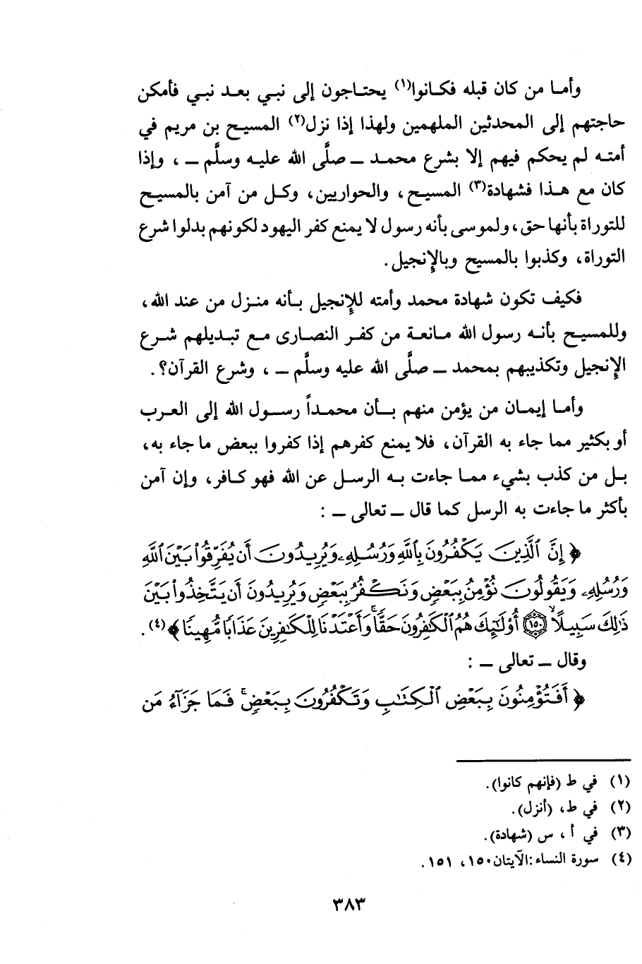 فَكَيْفَ تَكُونُ شَهَادَةُ مُحَمَّدٍ وَأُمَّتِهِ لِلْإِنْجِيلِ بِأَنَّهُ مُنَزَّلٌ مِنْ عِنْدِ اللَّهِ وَلِلْمَسِيحِ بِأَنَّهُ رَسُولُ اللَّهِ - صَلَّى اللَّهُ عَلَيْهِ وَسَلَّمَ - مَانِعَةً مِنْ كُفْرِ النَّصَارَى مَعَ تَبْدِيلِهِمْ شَرْعَ الْإِنْجِيلِ وَتَكْذِيبِهِمْ بِمُحَمَّدٍ - صَلَّى اللَّهُ عَلَيْهِ وَسَلَّمَ - وَشَرْعِ الْقُرْآنِ؟ .