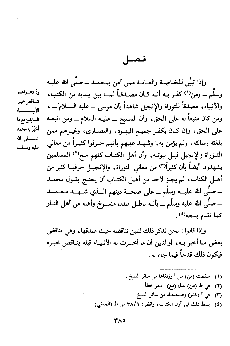 وَإِذَا تَبَيَّنَ لِلْخَاصَّةِ وَالْعَامَّةِ مِمَّنْ آمَنَ بِمُحَمَّدٍ - صَلَّى اللَّهُ عَلَيْهِ وَسَلَّمَ - وَمَنْ كَفَرَ بِهِ أَنَّهُ كَانَ مُصَدِّقًا لِمَا بَيْنَ يَدَيْهِ مِنَ الْكُتُبِ وَالْأَنْبِيَاءِ مُصَدِّقًا لِلتَّوْرَاةِ وَالْإِنْجِيلِ شَاهِدًا بِأَنَّ مُوسَى - عَلَيْهِ السَّلَامُ - وَمَنْ كَانَ مُتَّبِعًا لَهُ عَلَى الْحَقِّ وَأَنَّ الْمَسِيحَ - عَلَيْهِ السَّلَامُ - وَمَنِ اتَّبَعَهُ عَلَى الْحَقِّ وَإِنْ كَانَ يُكَفِّرُ جَمِيعَ الْيَهُودِ وَالنَّصَارَى وَغَيْرِهِمْ مِمَّنْ بَلَغَتْهُ رِسَالَتُهُ وَلَمْ يُؤْمِنْ بِهِ وَشَهِدَ عَلَيْهِمْ بِأَنَّهُمْ حَرَّفُوا كَثِيرًا مِنْ مَعَانِي التَّوْرَاةِ وَالْإِنْجِيلِ قَبْلَ نُبُوَّتِهِ وَأَنَّ أَهْلَ الْكِتَابِ كُلَّهُمْ مَعَ الْمُسْلِمِينَ يَشْهَدُونَ أَيْضًا بِأَنَّ كَثِيرًا مِنْ مَعَانِي التَّوْرَاةِ وَالْإِنْجِيلِ حَرَّفَهَا كَثِيرٌ مِنْ أَهْلِ الْكِتَابِ لَمْ يَجُزْ لِأَحَدٍ مِنْ أَهْلِ الْكِتَابِ أَنْ يَحْتَجَّ بِقَوْلِ مُحَمَّدٍ - صَلَّى اللَّهُ عَلَيْهِ وَسَلَّمَ - عَلَى صِحَّةِ دِينِهِمُ الَّذِي شَهِدَ مُحَمَّدٌ - صَلَّى اللَّهُ عَلَيْهِ وَسَلَّمَ - بِأَنَّهُ بَاطِلٌ مُبَدَّلٌ مَنْسُوخٌ وَأَهْلُهُ مِنْ أَهْلِ النَّارِ كَمَا تَقَدَّمَ بَسْطُهُ.