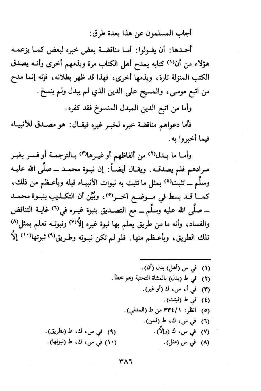 وَأَمَّا مَا بُدِّلَ مِنْ أَلْفَاظِهِمْ أَوْ غَيْرِهَا بِالتَّرْجَمَةِ أَوْ فُسِّرَ بِغَيْرِ مُرَادِهِمْ فَلَمْ يُصَدِّقْهُ وَيُقَالُ أَيْضًا إِنَّ نُبُوَّةَ مُحَمَّدٍ - صَلَّى اللَّهُ عَلَيْهِ وَسَلَّمَ - تَثْبُتُ بِمِثْلِ مَا تَثْبُتُ بِهِ نُبُوَّاتُ الْأَنْبِيَاءِ قَبْلَهُ وَبِأَعْظَمَ مِنْ ذَلِكَ كَمَا قَدْ بُسِطَ فِي مَوْضِعٍ آخَرَ وَبَيَّنَ أَنَّ التَّكْذِيبَ بِنُبُوَّةِ مُحَمَّدٍ - صَلَّى اللَّهُ عَلَيْهِ وَسَلَّمَ - مَعَ التَّصْدِيقِ بِنُبُوَّةِ غَيْرِهِ فِي غَايَةِ التَّنَاقُضِ وَالْفَسَادِ وَأَنَّهُ مَا مِنْ طَرِيقٍ يُعْلَمُ بِهَا نُبُوَّةُ غَيْرِهِ إِلَّا وَنُبُوَّتُهُ تُعْلَمُ بِمِثْلِ تِلْكَ الطَّرِيقِ وَبِأَعْظَمَ مِنْهَا فَلَوْ لَمْ تَكُنْ نُبُوَّتُهُ وَطَرِيقُ ثُبُوتِهَا إِلَّا