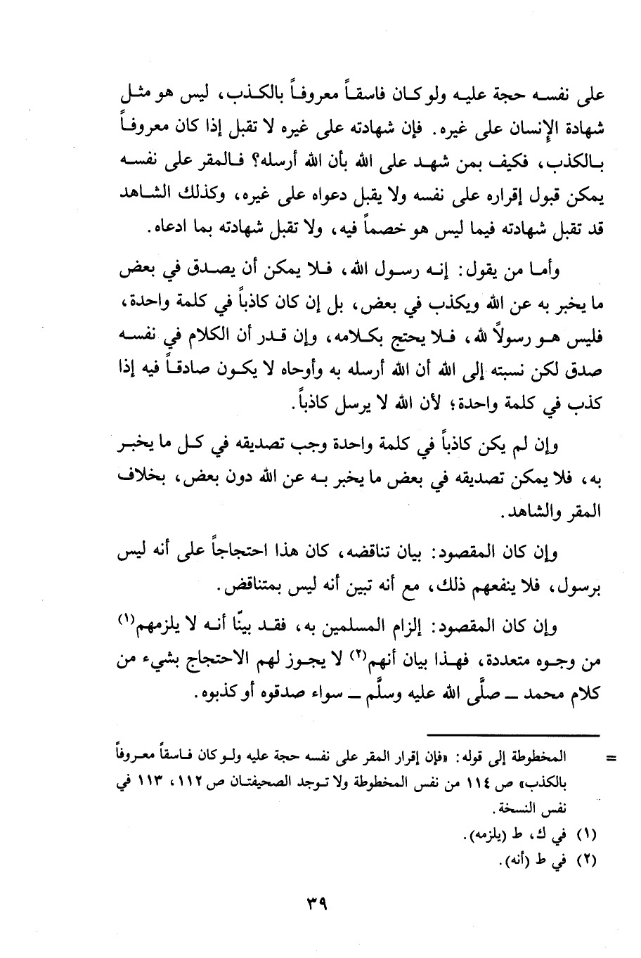 وَإِنْ كَانَ الْمَقْصُودُ إِلْزَامَ الْمُسْلِمِينَ بِهِ، فَقَدْ بَيَّنَّا أَنَّهُ لَا يَلْزَمُهُمْ مِنْ وُجُوهٍ مُتَعَدِّدَةٍ، فَهَذَا بَيَانُ أَنَّهُمْ لَا يَجُوزُ لَهُمُ الِاحْتِجَاجُ بِشَيْءٍ مِنْ كَلَامِ مُحَمَّدٍ - صَلَّى اللَّهُ عَلَيْهِ وَسَلَّمَ - سَوَاءً صَدَّقُوهُ أَوْ كَذَّبُوهُ.