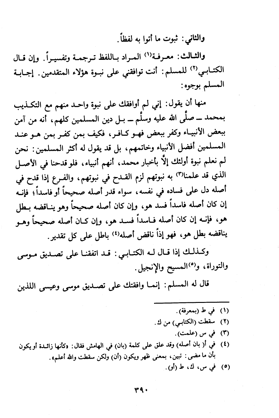 وَالثَّالِثُ: مَعْرِفَةُ الْمُرَادِ بِاللَّفْظِ تَرْجَمَةً وَتَفْسِيرًا وَإِنْ قَالَ الْكِتَابِيُّ لِلْمُسْلِمِ: أَنْتَ تُوَافِقُنِي عَلَى نُبُوَّةِ هَؤُلَاءِ الْمُتَقَدِّمِينَ، إِجَابَةُ الْمُسْلِمِ بِوُجُوهٍ.