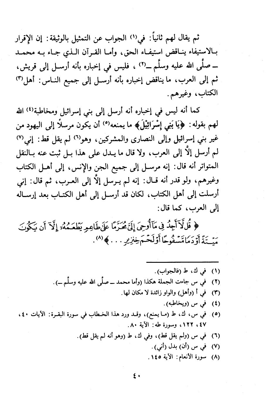 ثُمَّ يُقَالُ لَهُمْ ثَانِيًا: فِي الْجَوَابِ عَنِ التَّمْثِيلِ بِالْوَثِيقَةِ: إِنَّ الْإِقْرَارَ بِالِاسْتِيفَاءِ يُنَاقِضُ اسْتِيفَاءَ الْحَقِّ، وَأَمَّا الْقُرْآنُ الَّذِي جَاءَ بِهِ مُحَمَّدٌ - صَلَّى اللَّهُ عَلَيْهِ وَسَلَّمَ - فَلَيْسَ فِي إِخْبَارِهِ بِأَنَّهُ أُرْسِلَ إِلَى قُرَيْشٍ ثُمَّ إِلَى الْعَرَبِ مَا يُنَاقِضُ إِخْبَارَهُ بِأَنَّهُ أُرْسِلَ إِلَى جَمِيعِ النَّاسِ: أَهْلِ الْكِتَابِ وَغَيْرِهِمْ.