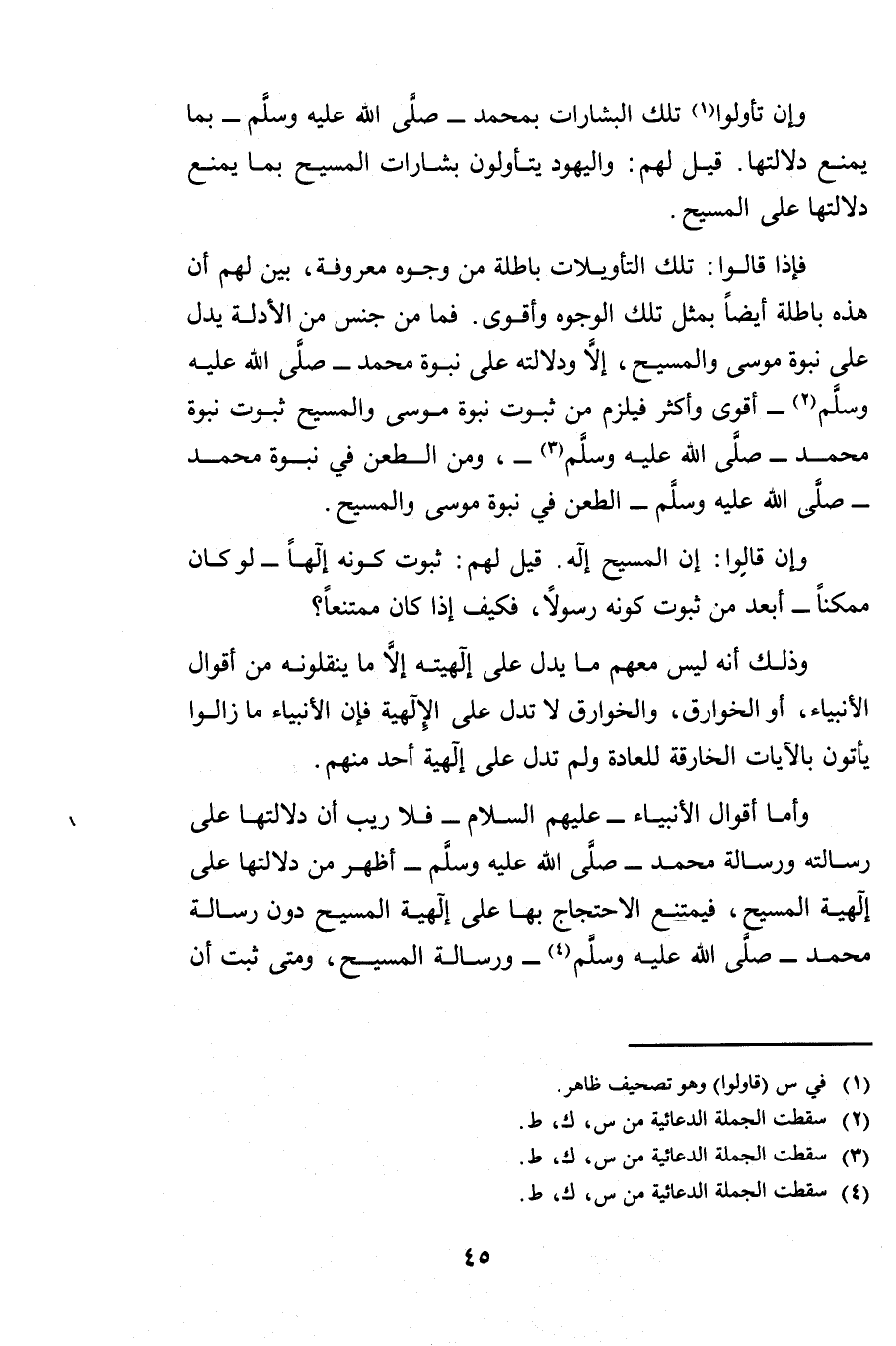 وَأَمَّا أَقْوَالُ الْأَنْبِيَاءِ - عَلَيْهِمُ السَّلَامُ - فَلَا رَيْبَ أَنَّ دَلَالَتَهَا عَلَى رِسَالَتِهِ وَرِسَالَةِ مُحَمَّدٍ - صَلَّى اللَّهُ عَلَيْهِ وَسَلَّمَ - أَظْهَرُ مِنْ دَلَالَتِهَا عَلَى إِلَهِيَّةِ الْمَسِيحِ فَيَمْتَنِعُ الِاحْتِجَاجُ بِهَا عَلَى إِلَهِيَّةِ الْمَسِيحِ دُونَ رِسَالَةِ مُحَمَّدٍ - صَلَّى اللَّهُ عَلَيْهِ وَسَلَّمَ - وَرِسَالَةِ الْمَسِيحِ وَمَتَى ثَبَتَ أَنَّ