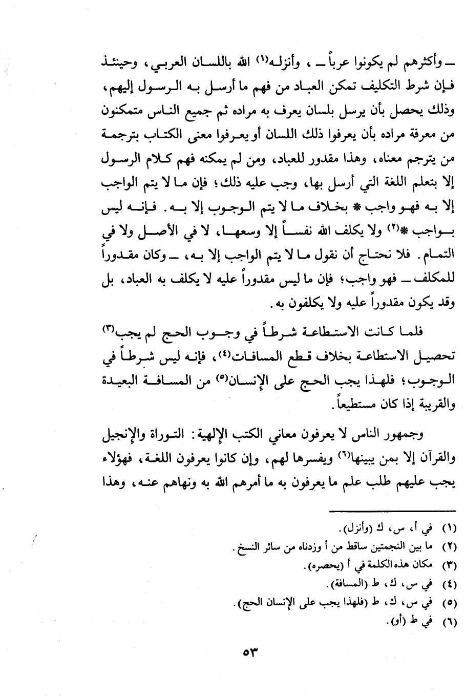- وَأَكْثَرُهُمْ لَمْ يَكُونُوا عَرَبًا - وَأَنْزَلَهُ اللَّهُ بِاللِّسَانِ الْعَرَبِيِّ وَحِينَئِذٍ، فَإِنَّ شَرْطَ التَّكْلِيفِ تَمَكُّنُ الْعِبَادَ مِنْ فَهْمِ مَا أُرْسِلَ بِهِ الرَّسُولُ إِلَيْهِمْ وَذَلِكَ يَحْصُلُ بِأَنْ يُرْسَلَ بِلِسَانٍ يُعْرَفُ بِهِ مُرَادُهُ ثُمَّ جَمِيعُ النَّاسِ مُتَمَكِّنُونَ مِنْ مَعْرِفَةِ مُرَادِهِ بِأَنْ يَعْرِفُوا ذَلِكَ اللِّسَانَ أَوْ يَعْرِفُوا مَعْنَى الْكِتَابِ بِتَرْجَمَةِ مَنْ يُتَرْجِمُ مَعْنَاهُ وَهَذَا مَقْدُورٌ لِلْعِبَادِ وَمَنْ لَمْ يُمْكِنْهُ فَهْمُ كَلَامِ الرَّسُولِ إِلَّا بِتَعَلُّمِ اللُّغَةِ الَّتِي أُرْسِلَ بِهَا وَجَبَ عَلَيْهِ ذَلِكَ، فَإِنَّ مَا لَا يَتِمُّ الْوَاجِبُ إِلَّا بِهِ فَهُوَ وَاجِبٌ بِخِلَافِ مَا لَا يَتِمُّ الْوُجُوبُ إِلَّا بِهِ، فَإِنَّهُ لَيْسَ بِوَاجِبٍ وَلَا يُكَلِّفُ اللَّهُ نَفْسًا إِلَّا وُسْعَهَا لَا فِي الْأَصْلِ وَلَا فِي التَّمَامِ فَلَا نَحْتَاجُ أَنْ نَقُولَ مَا لَا يَتِمُّ الْوَاجِبُ إِلَّا بِهِ - وَكَانَ مَقْدُورًا لِلْمُكَلَّفِ - فَهُوَ وَاجِبٌ، فَإِنَّ مَا لَيْسَ مَقْدُورًا عَلَيْهِ لَا يُكَلَّفُ بِهِ الْعِبَادُ بَلْ وَقَدْ يَكُونُ مَقْدُورًا عَلَيْهِ وَلَا يُكَلَّفُونَ بِهِ.