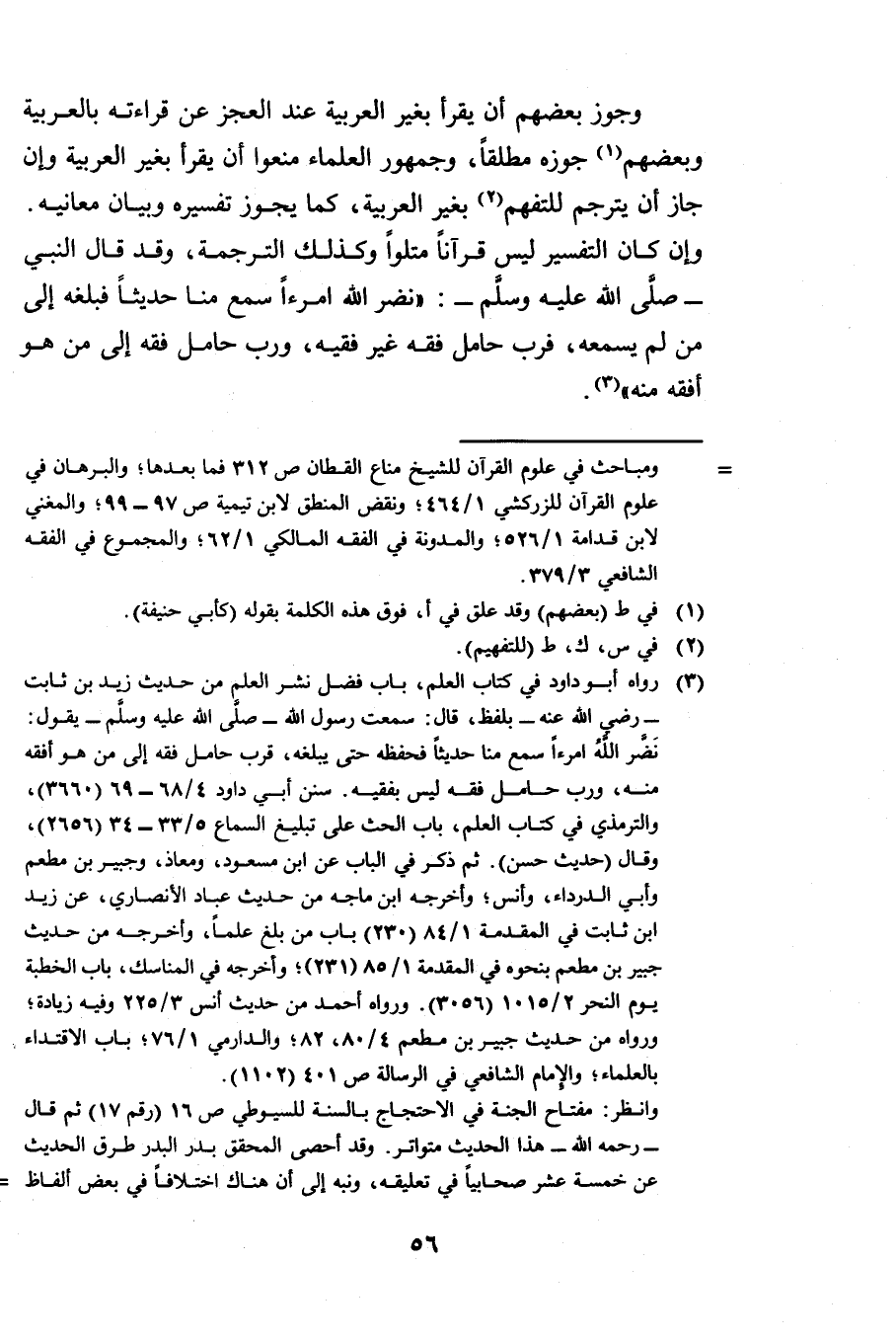 وَجَوَّزَ بَعْضُهُمْ أَنْ يُقْرَأُ بِغَيْرِ الْعَرَبِيَّةِ عِنْدَ الْعَجْزِ عَنْ قِرَاءَتِهِ بِالْعَرَبِيَّةِ وَبَعْضُهُمْ جَوَّزَهُ مُطْلَقًا وَجُمْهُورُ الْعُلَمَاءِ مَنَعُوا أَنْ يُقْرَأَ بِغَيْرِ الْعَرَبِيَّةِ وَإِنْ جَازَ أَنْ يُتَرْجَمَ لِلتَّفَهُّمِ بِغَيْرِ الْعَرَبِيَّةِ كَمَا يَجُوزُ تَفْسِيرُهُ وَبَيَانُ مَعَانِيهِ وَإِنْ كَانَ التَّفْسِيرُ لَيْسَ قُرْآنًا مَتْلُوًّا وَكَذَلِكَ التَّرْجَمَةُ وَقَدْ قَالَ: النَّبِيُّ - صَلَّى اللَّهُ عَلَيْهِ وَسَلَّمَ - «نَضَّرَ اللَّهُ امْرَءًا سَمِعَ مِنَّا حَدِيثًا فَبَلَّغَهُ إِلَى مَنْ لَمْ يَسْمَعْهُ فَرُبَّ حَامِلِ فِقْهٍ غَيْرِ فَقِيهٍ وَرُبَّ حَامِلِ فِقْهٍ إِلَى مَنْ هُوَ أَفْقَهُ مِنْهُ» .