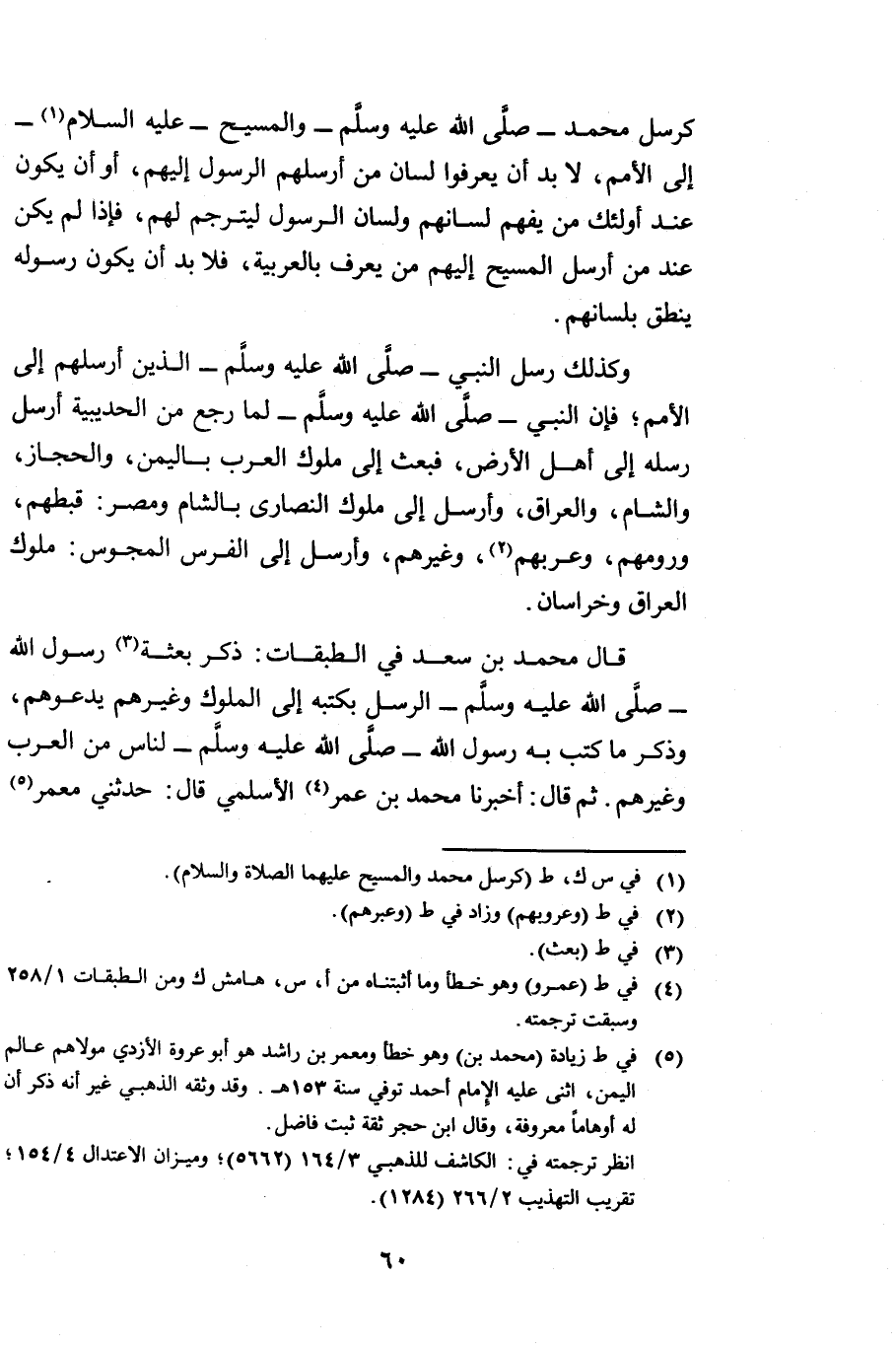 قَالَ مُحَمَّدُ بْنُ سَعْدٍ فِي الطَّبَقَاتِ ذِكْرُ بَعْثَةِ رَسُولِ اللَّهِ - صَلَّى اللَّهُ عَلَيْهِ وَسَلَّمَ - الرُّسُلَ بِكُتُبِهِ إِلَى الْمُلُوكِ وَغَيْرِهِمْ يَدْعُوهُمْ وَذَكَرَ مَا كَتَبَ بِهِ رَسُولُ اللَّهِ - صَلَّى اللَّهُ عَلَيْهِ وَسَلَّمَ - لِنَاسٍ مِنَ الْعَرَبِ وَغَيْرِهِمْ ثُمَّ قَالَ: أَخْبَرَنَا مُحَمَّدُ بْنُ عُمَرَ الْأَسْلَمِيُّ قَالَ: حَدَّثَنِي مَعْمَرُ