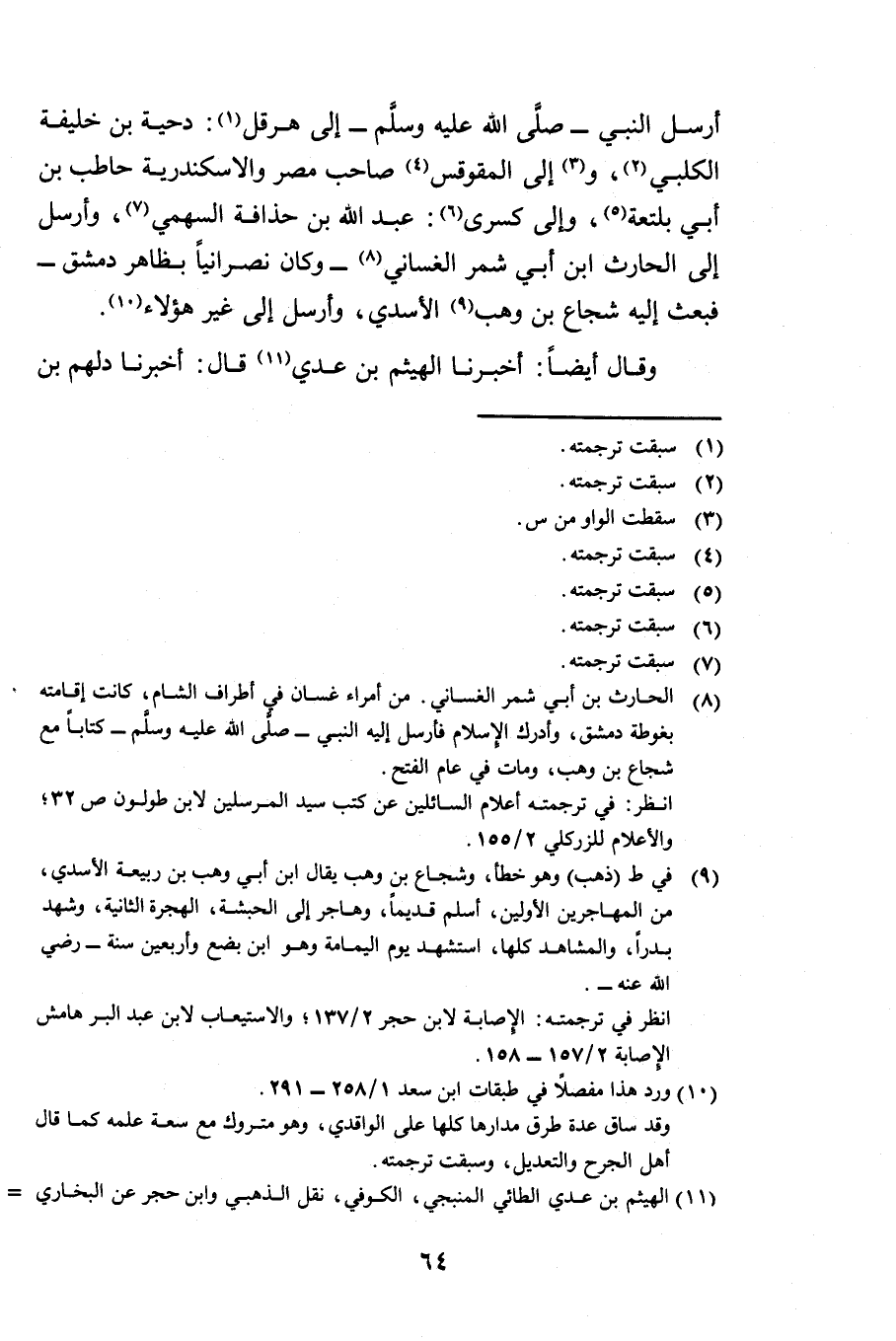أَرْسَلَ النَّبِيُّ - صَلَّى اللَّهُ عَلَيْهِ وَسَلَّمَ - إِلَى هِرَقْلَ دِحْيَةَ بْنَ خَلِيفَةَ الْكَلْبِيَّ وَإِلَى الْمُقَوْقِسِ صَاحِبِ مِصْرَ وَالْإِسْكَنْدَرِيَّةِ حَاطِبَ بْنَ أَبِي بَلْتَعَةَ وَإِلَى كِسْرَى عَبْدَ اللَّهِ بْنَ حُذَافَةَ السَّهْمِيَّ وَأَرْسَلَ إِلَى الْحَارِثِ بْنِ أَبِي شِمْرٍ الْغَسَّانِيِّ وَكَانَ نَصْرَانِيًّا بِظَاهِرِ دِمَشْقَ فَبَعَثَ إِلَيْهِ شُجَاعَ بْنَ وَهْبٍ الْأَسَدِيَّ وَأَرْسَلَ إِلَى غَيْرِ هَؤُلَاءِ.
