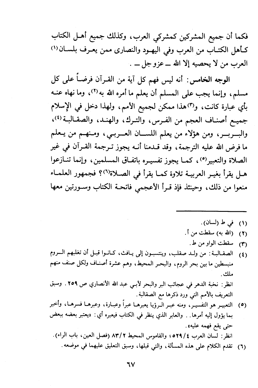 الْوَجْهُ الْخَامِسُ: أَنَّهُ لَيْسَ فَهْمُ كُلِّ آيَةٍ مِنَ الْقُرْآنِ فَرْضًا عَلَى كُلِّ مُسْلِمٍ وَإِنَّمَا يَجِبُ عَلَى الْمُسْلِمِ أَنْ يَعْلَمَ مَا أَمَرَهُ اللَّهُ بِهِ وَمَا نَهَاهُ عَنْهُ بِأَيِّ عِبَارَةٍ كَانَتْ وَهَذَا مُمْكِنٌ لِجَمِيعِ الْأُمَمِ وَلِهَذَا دَخَلَ فِي الْإِسْلَامِ جَمِيعُ أَصْنَافِ الْعَجَمِ مِنَ الْفُرْسِ وَالتُّرْكِ وَالْهِنْدِ وَالصَّقَالِبَةِ وَالْبَرْبَرِ وَمِنْ هَؤُلَاءِ مَنْ يَعْلَمُ اللِّسَانَ الْعَرَبِيَّ وَمِنْهُمْ مَنْ يَعْلَمُ مَا فَرَضَ اللَّهُ عَلَيْهِ التَّرْجَمَةَ وَقَدْ قَدَّمْنَا أَنَّهُ يَجُوزُ تَرْجَمَةُ الْقُرْآنِ فِي غَيْرِ الصَّلَاةِ وَالتَّعْبِيرُ كَمَا يَجُوزُ تَفْسِيرُهُ بِاتِّفَاقِ الْمُسْلِمِينَ وَإِنَّمَا تَنَازَعُوا هَلْ يُقْرَأُ بِغَيْرِ الْعَرَبِيَّةِ تِلَاوَةً كَمَا يُقْرَأُ فِي الصَّلَاةِ فَجُمْهُورُ الْعُلَمَاءِ مَنَعُوا مِنْ ذَلِكَ وَحِينَئِذٍ فَإِذَا قَرَأَ الْأَعْجَمِيُّ فَاتِحَةَ الْكِتَابِ وَسُورَتَيْنِ مَعَهَا