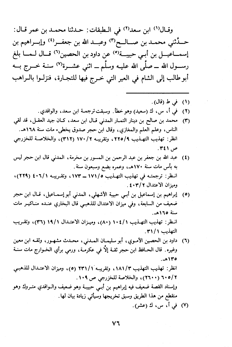 وَقَالَ ابْنُ سَعْدٍ فِي الطَّبَقَاتِ: حَدَّثَنَا مُحَمَّدُ بْنُ عُمَرَ قَالَ: حَدَّثَنِي مُحَمَّدُ بْنُ صَالِحٍ وَعَبْدُ اللَّهِ بْنُ جَعْفَرٍ وَإِبْرَاهِيمُ بْنُ إِسْمَاعِيلَ بْنِ أَبِي حَبِيبَةَ عَنْ دَاوُدَ بْنِ الْحُصَيْنِ قَالَ: لَمَّا بَلَغَ رَسُولُ اللَّهِ - صَلَّى اللَّهُ عَلَيْهِ وَسَلَّمَ - اثْنَيْ عَشْرَةَ سَنَةً خَرَجَ بِهِ أَبُو طَالِبٍ إِلَى الشَّامِ فِي الْعِيرِ الَّتِي خَرَجَ فِيهَا لِلتِّجَارَةِ فَنَزَلُوا بِالرَّاهِبِ