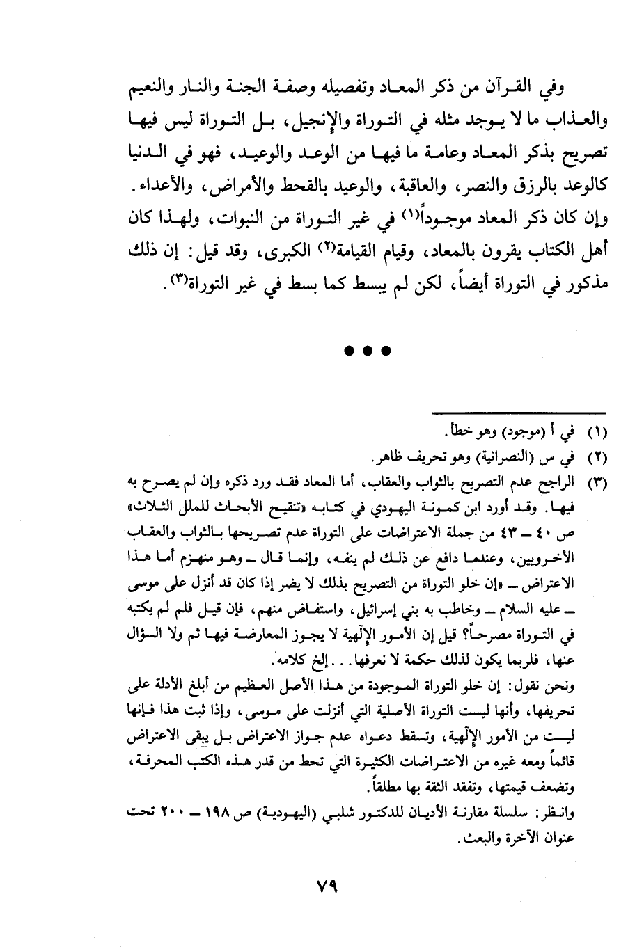 وَفِي الْقُرْآنِ مِنْ ذِكْرِ الْمَعَادِ وَتَفْصِيلِهِ وَصِفَةِ الْجَنَّةِ وَالنَّارِ وَالنَّعِيمِ وَالْعَذَابِ مَا لَا يُوجَدُ مِثْلُهُ فِي التَّوْرَاةِ وَالْإِنْجِيلِ بَلِ التَّوْرَاةُ لَيْسَ فِيهَا تَصْرِيحٌ بِذِكْرِ الْمَعَادِ وَعَامَّةُ مَا فِيهَا مِنَ الْوَعْدِ وَالْوَعِيدِ فَهُوَ فِي الدُّنْيَا كَالْوَعْدِ بِالرِّزْقِ وَالنَّصْرِ وَالْعَاقِبَةِ وَالْوَعِيدِ بِالْقَحْطِ وَالْأَمْرَاضِ وَالْأَعْدَاءِ. وَإِنْ كَانَ ذِكْرُ الْمَعَادِ مَوْجُودًا فِي غَيْرِ التَّوْرَاةِ مِنَ النُّبُوَّاتِ وَلِهَذَا كَانَ أَهْلُ الْكِتَابِ يُقِرُّونَ بِالْمَعَادِ وَقِيَامِ الْقِيَامَةِ الْكُبْرَى وَقَدْ قِيلَ إِنَّ ذَلِكَ مَذْكُورٌ فِي التَّوْرَاةِ أَيْضًا لَكِنْ لَمْ يُبْسَطْ كَمَا بُسِطَ فِي غَيْرِ التَّوْرَاةِ.