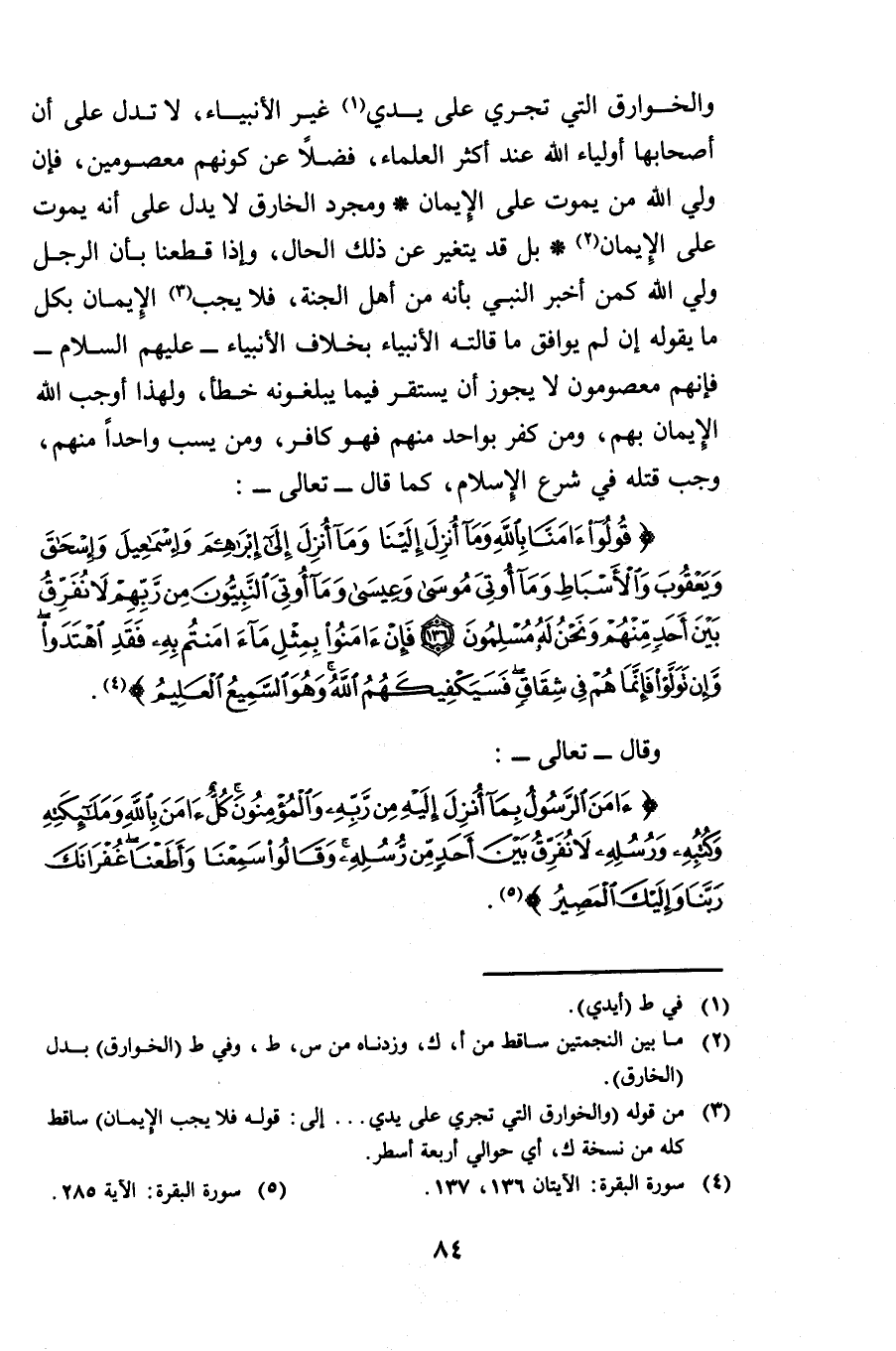 وَالْخَوَارِقُ الَّتِي تَجْرِي عَلَى يَدَيْ غَيْرِ الْأَنْبِيَاءِ لَا تَدُلُّ عَلَى أَنَّ أَصْحَابَهَا أَوْلِيَاءُ اللَّهِ عِنْدَ أَكْثَرِ الْعُلَمَاءِ فَضْلًا عَنْ كَوْنِهِمْ مَعْصُومِينَ، فَإِنَّ وَلِيَّ اللَّهِ مَنْ يَمُوتُ عَلَى الْإِيمَانِ وَمُجَرَّدُ الْخَارِقِ لَا يَدُلُّ عَلَى أَنَّهُ يَمُوتُ عَلَى الْإِيمَانِ بَلْ قَدْ يَتَغَيَّرُ عَنْ ذَلِكَ الْحَالِ وَإِذَا قَطَعْنَا بِأَنَّ الرَّجُلَ وَلِيُّ اللَّهِ كَمَنْ أَخْبَرَ النَّبِيُّ بِأَنَّهُ مِنْ أَهْلِ الْجَنَّةِ فَلَا يَجِبُ الْإِيمَانُ بِكُلِّ مَا يَقُولُهُ: إِنْ لَمْ يُوَافِقْ مَا قَالَتْهُ الْأَنْبِيَاءُ بِخِلَافِ الْأَنْبِيَاءِ - عَلَيْهِمُ السَّلَامُ - فَإِنَّهُمْ مَعْصُومُونَ لَا يَجُوزُ أَنْ يَسْتَقِرَّ فِيمَا يُبَلِّغُونَهُ خَطَأٌ وَلِهَذَا أَوْجَبَ اللَّهُ الْإِيمَانَ بِهِمْ وَمَنْ كَفَرَ بِوَاحِدٍ مِنْهُمْ فَهُوَ كَافِرٌ وَمَنْ يَسُبُّ وَاحِدًا مِنْهُمْ وَجَبَ قَتْلُهُ فِي شَرْعِ الْإِسْلَامِ كَمَا قَالَ - تَعَالَى -: {قُولُوا آمَنَّا بِاللَّهِ وَمَا أُنْزِلَ إِلَيْنَا وَمَا أُنْزِلَ إِلَى إِبْرَاهِيمَ وَإِسْمَاعِيلَ وَإِسْحَاقَ وَيَعْقُوبَ وَالْأَسْبَاطِ وَمَا أُوتِيَ مُوسَى وَعِيسَى وَمَا أُوتِيَ النَّبِيُّونَ مِنْ رَبِّهِمْ لَا نُفَرِّقُ بَيْنَ أَحَدٍ مِنْهُمْ وَنَحْنُ لَهُ مُسْلِمُونَ} [البقرة: 136] (136) {فَإِنْ آمَنُوا بِمِثْلِ مَا آمَنْتُمْ بِهِ فَقَدِ اهْتَدَوْا وَإِنْ تَوَلَّوْا فَإِنَّمَا هُمْ فِي شِقَاقٍ فَسَيَكْفِيكَهُمُ اللَّهُ وَهُوَ السَّمِيعُ الْعَلِيمُ} [البقرة: 137] وَقَالَ - تَعَالَى -: {آمَنَ الرَّسُولُ بِمَا أُنْزِلَ إِلَيْهِ مِنْ رَبِّهِ وَالْمُؤْمِنُونَ كُلٌّ آمَنَ بِاللَّهِ وَمَلَائِكَتِهِ وَكُتُبِهِ وَرُسُلِهِ لَا نُفَرِّقُ بَيْنَ أَحَدٍ مِنْ رُسُلِهِ وَقَالُوا سَمِعْنَا وَأَطَعْنَا غُفْرَانَكَ رَبَّنَا وَإِلَيْكَ الْمَصِيرُ} [البقرة: 285] .