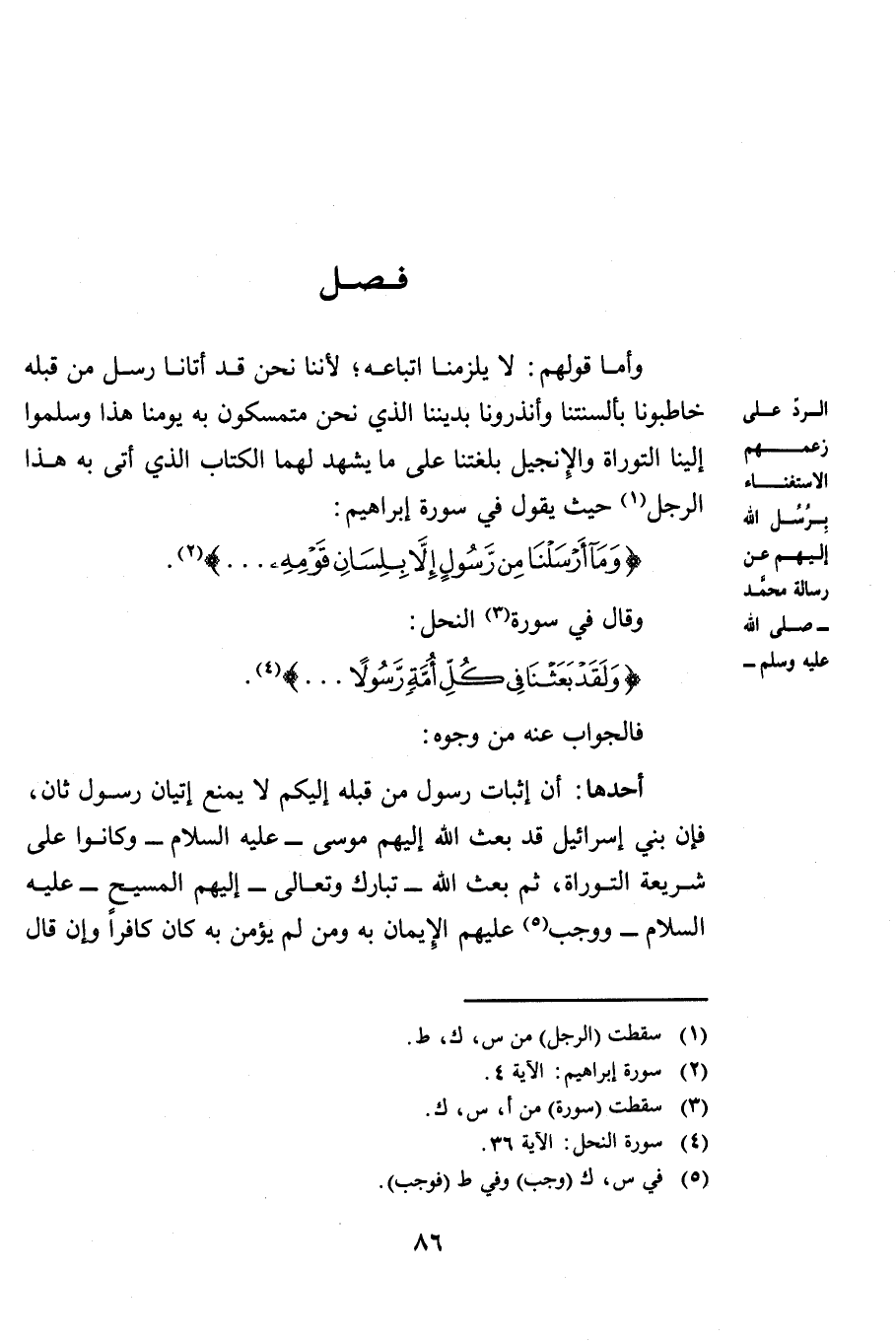 وَأَمَّا قَوْلُهُمْ: لَا يَلْزَمُنَا اتِّبَاعُهُ لِأَنَّنَا نَحْنُ قَدْ أَتَانَا رُسُلٌ مِنْ قَبْلِهِ خَاطَبُونَا بِأَلْسِنَتِنَا وَأَنْذَرُونَا بِدِينِنَا الَّذِي نَحْنُ مُتَمَسِّكُونَ بِهِ يَوْمَنَا هَذَا وَسَلَّمُوا إِلَيْنَا التَّوْرَاةَ وَالْإِنْجِيلَ بِلُغَتِنَا عَلَى مَا يَشْهَدُ لَهُمَا الْكِتَابُ الَّذِي أَتَى بِهِ هَذَا الرَّجُلُ حَيْثُ يَقُولُ فِي سُورَةِ إِبْرَاهِيمَ {وَمَا أَرْسَلْنَا مِنْ رَسُولٍ إِلَّا بِلِسَانِ قَوْمِهِ} [إبراهيم: 4] وَقَالَ: فِي سُورَةِ النَّحْلِ {وَلَقَدْ بَعَثْنَا فِي كُلِّ أُمَّةٍ رَسُولًا} [النحل: 36] فَالْجَوَابُ عَنْهُ مِنْ وُجُوهٍ: