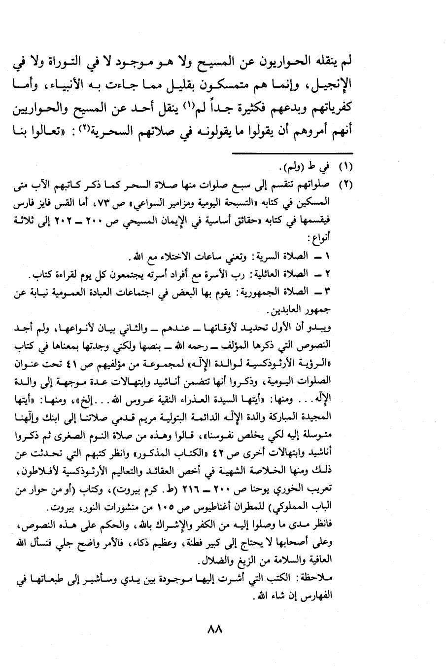 لَمْ يَنْقُلْهُ الْحَوَارِيُّونَ عَنِ الْمَسِيحِ وَلَا هُوَ مَوْجُودٌ لَا فِي التَّوْرَاةِ وَلَا فِي الْإِنْجِيلِ وَإِنَّمَا هُمْ مُتَمَسِّكُونَ بِقَلِيلٍ مِمَّا جَاءَتْ بِهِ الْأَنْبِيَاءُ وَأَمَّا كُفْرِيَّاتُهُمْ وَبِدَعُهُمْ فَكَثِيرَةٌ جِدًّا لَمْ يَنْقُلْ أَحَدٌ عَنِ الْمَسِيحِ وَالْحَوَارِيِّينَ أَنَّهُمْ أَمَرُوهُمْ أَنْ يَقُولُوا مَا يَقُولُونَهُ فِي صَلَاتِهِمُ السِّحْرِيَّةِ " تَعَالَوْا بِنَا