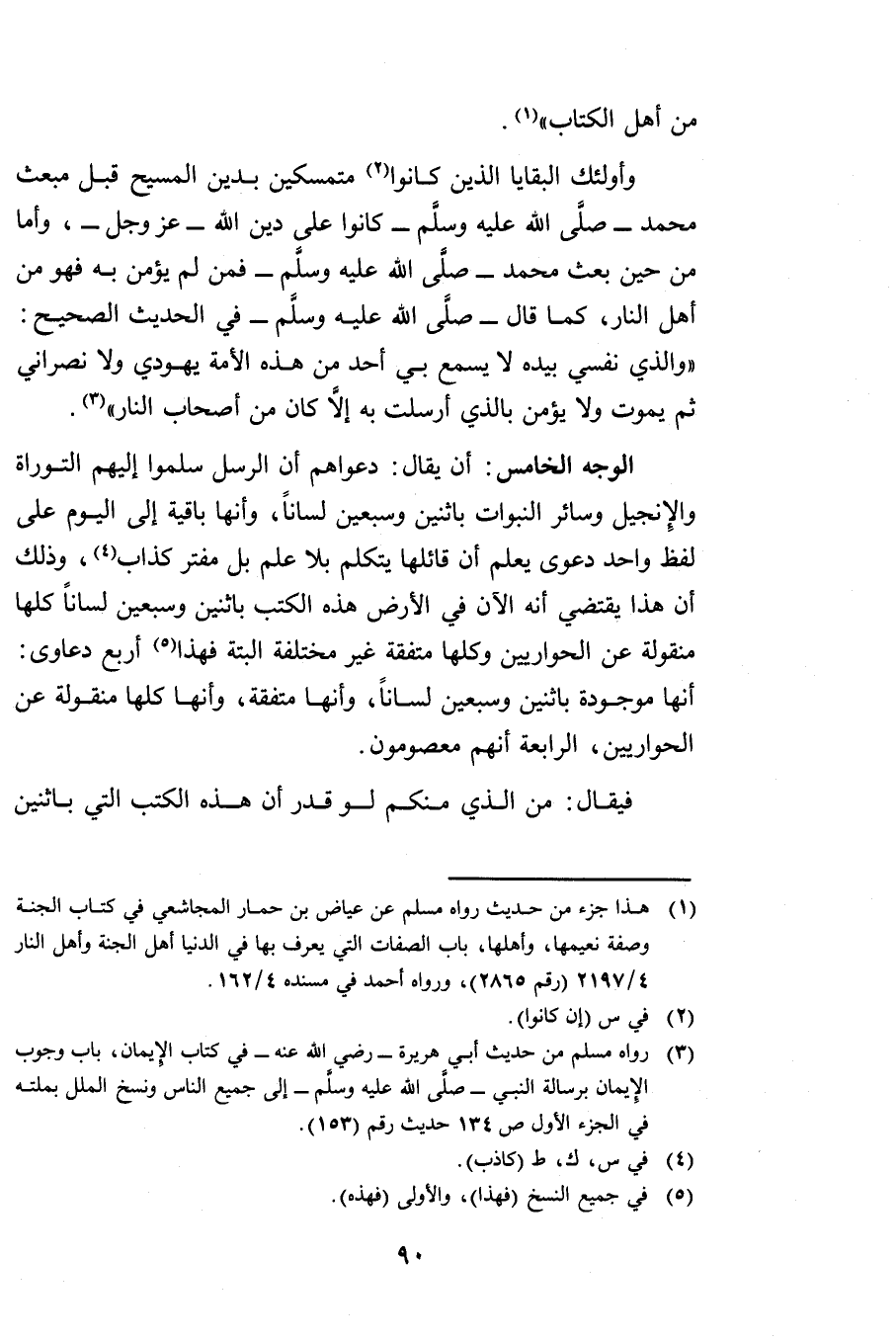 الْوَجْهُ الْخَامِسُ: أَنْ يُقَالَ دَعْوَاهُمْ أَنَّ الرُّسُلَ سَلَّمُوا إِلَيْهِمُ التَّوْرَاةَ وَالْإِنْجِيلَ وَسَائِرَ النُّبُوَّاتِ بِاثْنَيْنِ وَسَبْعِينَ لِسَانًا وَأَنَّهَا بَاقِيَةٌ إِلَى الْيَوْمِ عَلَى لَفْظٍ وَاحِدٍ دَعْوَى يُعْلَمُ أَنَّ قَائِلَهَا يَتَكَلَّمُ بِلَا عِلْمٍ بَلْ مُفْتَرٍ كَذَّابٌ وَذَلِكَ أَنَّ هَذَا يَقْتَضِي أَنَّهُ الْآنَ فِي الْأَرْضِ هَذِهِ الْكُتُبُ بِاثْنَيْنِ وَسَبْعِينَ لِسَانًا كُلُّهَا مَنْقُولَةٌ عَنِ الْحَوَارِيِّينَ وَكُلُّهَا مُتَّفِقَةٌ غَيْرُ مُخْتَلِفَةٍ الْبَتَّةَ فَهَذَا أَرْبَعُ دَعَاوَى أَنَّهَا مَوْجُودَةٌ بِاثْنَيْنِ وَسَبْعِينَ لِسَانًا وَأَنَّهَا مُتَّفِقَةٌ وَأَنَّهَا كُلَّهَا مَنْقُولَةٌ عَنِ الْحَوَارِيِّينَ الرَّابِعَةُ أَنَّهُمْ مَعْصُومُونَ.