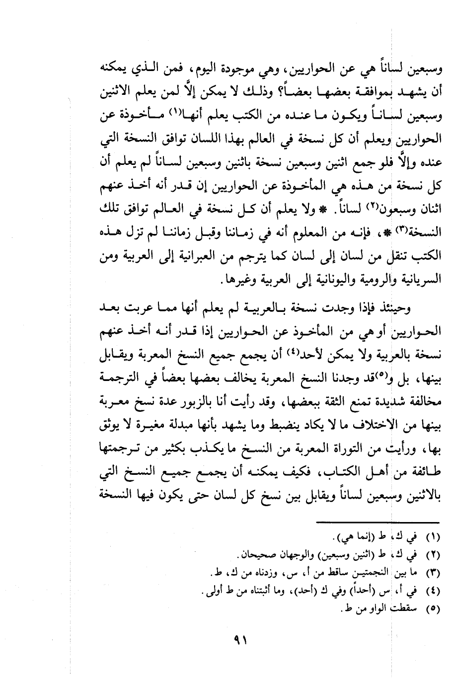 وَسَبْعِينَ لِسَانًا هِيَ عَنِ الْحَوَارِيِّينَ وَهِيَ مَوْجُودَةٌ الْيَوْمَ فَمَنِ الَّذِي يُمْكِنُهُ أَنْ يَشْهَدَ بِمُوَافَقَةِ بَعْضِهَا بَعْضًا وَذَلِكَ لَا يُمْكِنُ إِلَّا لِمَنْ يَعْلَمُ الِاثْنَيْنِ وَسَبْعِينَ لِسَانًا وَيَكُونُ مَا عِنْدَهُ مِنَ الْكُتُبِ يَعْلَمُ أَنَّهَا مَأْخُوذَةٌ عَنِ الْحَوَارِيِّينَ وَيَعْلَمُ أَنَّ كُلَّ نُسْخَةٍ فِي الْعَالَمِ بِهَذَا اللِّسَانِ تُوَافِقُ النُّسْخَةَ الَّتِي عِنْدَهُ وَإِلَّا فَلَوْ جَمَعَ اثْنَيْنِ وَسَبْعِينَ نُسْخَةً بِاثْنَيْنِ وَسَبْعِينَ لِسَانًا لَمْ يَعْلَمْ أَنَّ كُلَّ نُسْخَةٍ مِنْ هَذِهِ هِيَ الْمَأْخُوذَةُ عَنِ الْحَوَارِيِّينَ إِنْ قُدِّرَ أَنَّهُ أُخِذَ عَنْهُمُ اثْنَانِ وَسَبْعُونَ لِسَانًا وَلَا يَعْلَمُ أَنَّ كُلَّ نُسْخَةٍ فِي الْعَالَمِ تُوَافِقُ تِلْكَ النُّسْخَةَ، فَإِنَّهُ مِنَ الْمَعْلُومِ أَنَّهُ فِي زَمَانِنَا وَقَبْلَ زَمَانِنَا لَمْ تَزَلْ هَذِهِ الْكُتُبُ تُنْقَلُ مِنْ لِسَانٍ إِلَى لِسَانٍ كَمَا يُتَرْجَمُ مِنَ الْعِبْرَانِيَّةِ إِلَى الْعَرَبِيَّةِ وَمِنَ السُّرْيَانِيَّةِ وَالرُّومِيَّةِ وَالْيُونَانِيَّةِ إِلَى الْعَرَبِيَّةِ وَغَيْرِهَا.