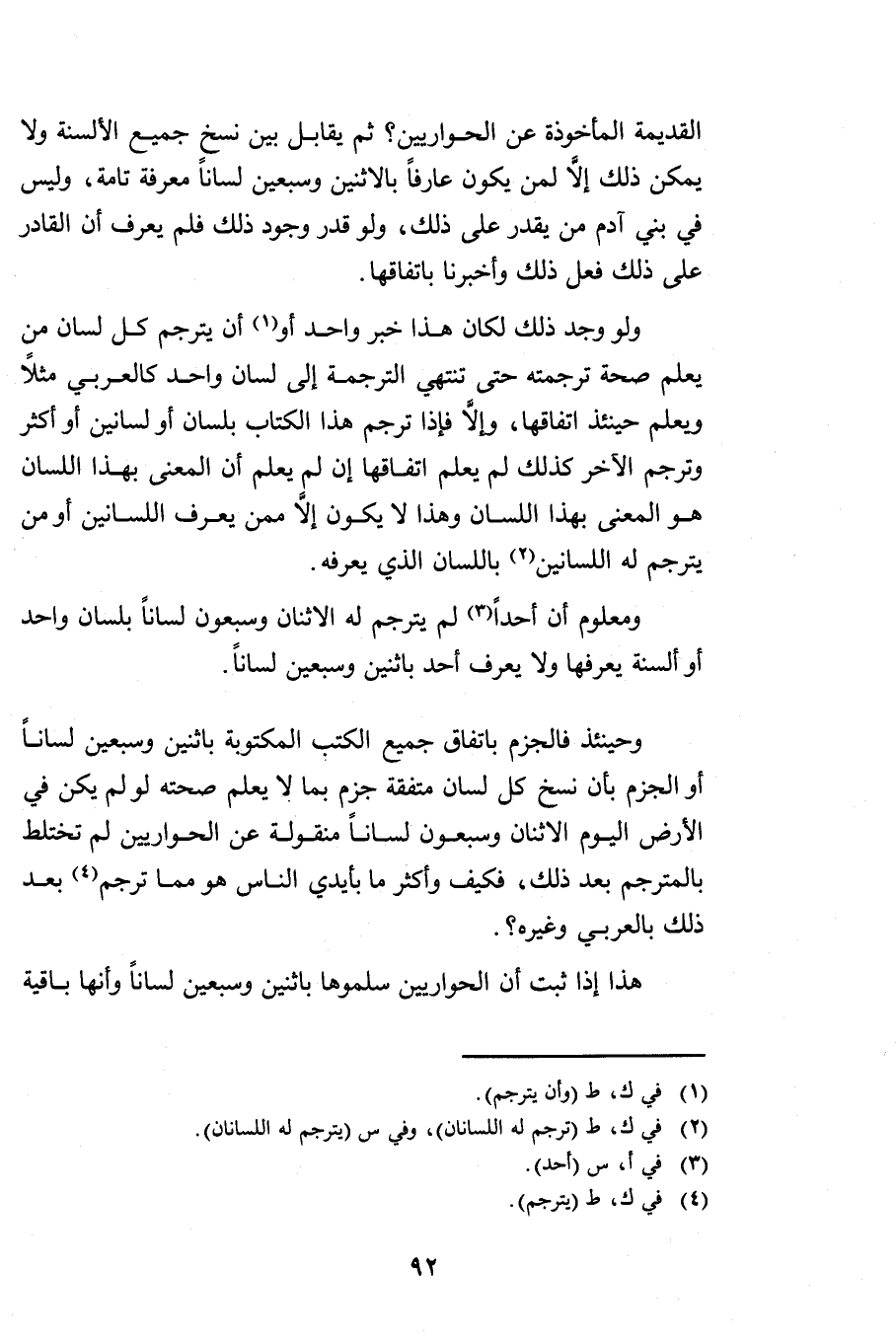 وَحِينَئِذٍ فَالْجَزْمُ بِاتِّفَاقِ جَمِيعِ الْكُتُبِ الْمَكْتُوبَةِ بِاثْنَيْنِ وَسَبْعِينَ لِسَانًا أَوِ الْجَزْمُ بِأَنَّ نُسَخَ كُلِّ لِسَانٍ مُتَّفِقَةٌ جَزْمٌ بِمَا لَا يُعْلَمُ صِحَّتُهُ لَوْ لَمْ يَكُنْ فِي الْأَرْضِ الْيَوْمَ الِاثْنَانِ وَسَبْعُونَ لِسَانًا مَنْقُولَةً عَنِ الْحَوَارِيِّينَ لَمْ تَخْتَلِطْ بِالْمُتَرْجَمِ بَعْدَ ذَلِكَ فَكَيْفَ وَأَكْثَرُ مَا بِأَيْدِي النَّاسِ هُوَ مِمَّا تُرْجِمَ بَعْدَ ذَلِكَ بِالْعَرَبِيِّ وَغَيْرِهِ.