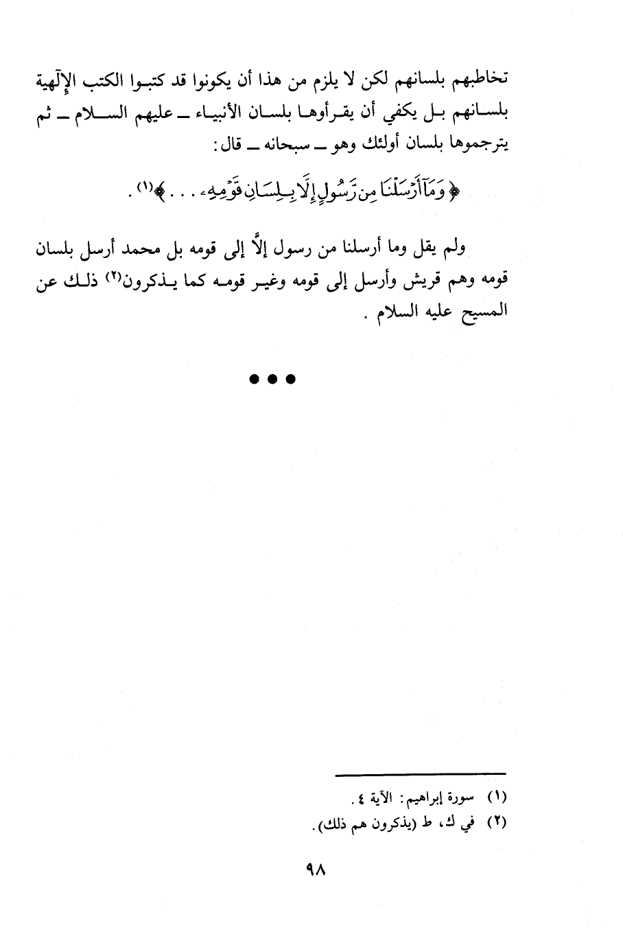 تُخَاطِبُهُمْ بِلِسَانِهِمْ لَكِنْ لَا يَلْزَمُ مِنْ هَذَا أَنْ يَكُونُوا قَدْ كَتَبُوا الْكُتُبَ الْإِلَهِيَّةَ بِلِسَانِهِمْ بَلْ يَكْفِي أَنْ يَقْرَءُوهَا بِلِسَانِ الْأَنْبِيَاءِ - عَلَيْهِمُ السَّلَامُ - ثُمَّ يُتَرْجِمُوهَا بِلِسَانِ أُولَئِكَ وَهُوَ سُبْحَانَهُ قَالَ {وَمَا أَرْسَلْنَا مِنْ رَسُولٍ إِلَّا بِلِسَانِ قَوْمِهِ} [إبراهيم: 4] وَلَمْ يَقُلْ وَمَا أَرْسَلْنَا مِنْ رَسُولٍ إِلَّا إِلَى قَوْمِهِ بَلْ مُحَمَّدٌ أُرْسِلَ بِلِسَانِ قَوْمِهِ وَهُمْ قُرَيْشٌ وَأُرْسِلَ إِلَى قَوْمِهِ وَغَيْرِ قَوْمِهِ كَمَا يَذْكُرُونَ ذَلِكَ عَنِ الْمَسِيحِ - عَلَيْهِ السَّلَامُ -