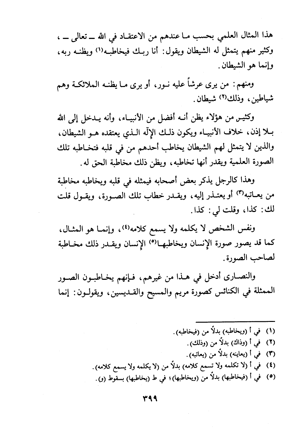 هَذَا الْمِثَالِ الْعِلْمِيِّ بِحَسَبِ مَا عِنْدَهُمْ مِنْ الِاعْتِقَادِ فِي اللَّهِ تَعَالَى، وَكَثِيرٌ مِنْهُمْ يَتَمَثَّلُ لَهُ الشَّيْطَانُ وَيَقُولُ: أَنَا رَبُّكَ، فَيُخَاطِبُهُ وَيَظُنُّهُ رَبَّهُ، وَإِنَّمَا هُوَ الشَّيْطَانُ.