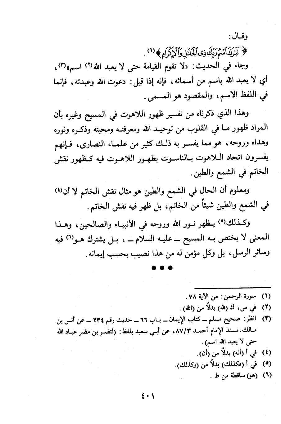 وَهَذَا الَّذِي ذَكَرْنَاهُ مِنْ تَفْسِيرِ ظُهُورِ اللَّاهُوتِ فِي الْمَسِيحِ وَغَيْرِهِ بِأَنَّ الْمُرَادَ ظُهُورُ مَا فِي الْقُلُوبِ مِنْ تَوْحِيدِ اللَّهِ وَمَعْرِفَتِهِ وَمَحَبَّتِهِ وَذِكْرِهِ وَنُورِهِ وَهُدَاهُ وَرُوحِهِ - هُوَ مِمَّا يُفَسِّرُ بِهِ ذَلِكَ كَثِيرٌ مِنْ عُلَمَاءِ النَّصَارَى، فَإِنَّهُمْ يُفَسِّرُونَ اتِّحَادَ اللَّاهُوتِ بِالنَّاسُوتِ بِظُهُورِ اللَّاهُوتِ فِيهِ كَظُهُورِ نَقْشِ الْخَاتَمِ فِي الشَّمْعِ وَالطِّينِ.