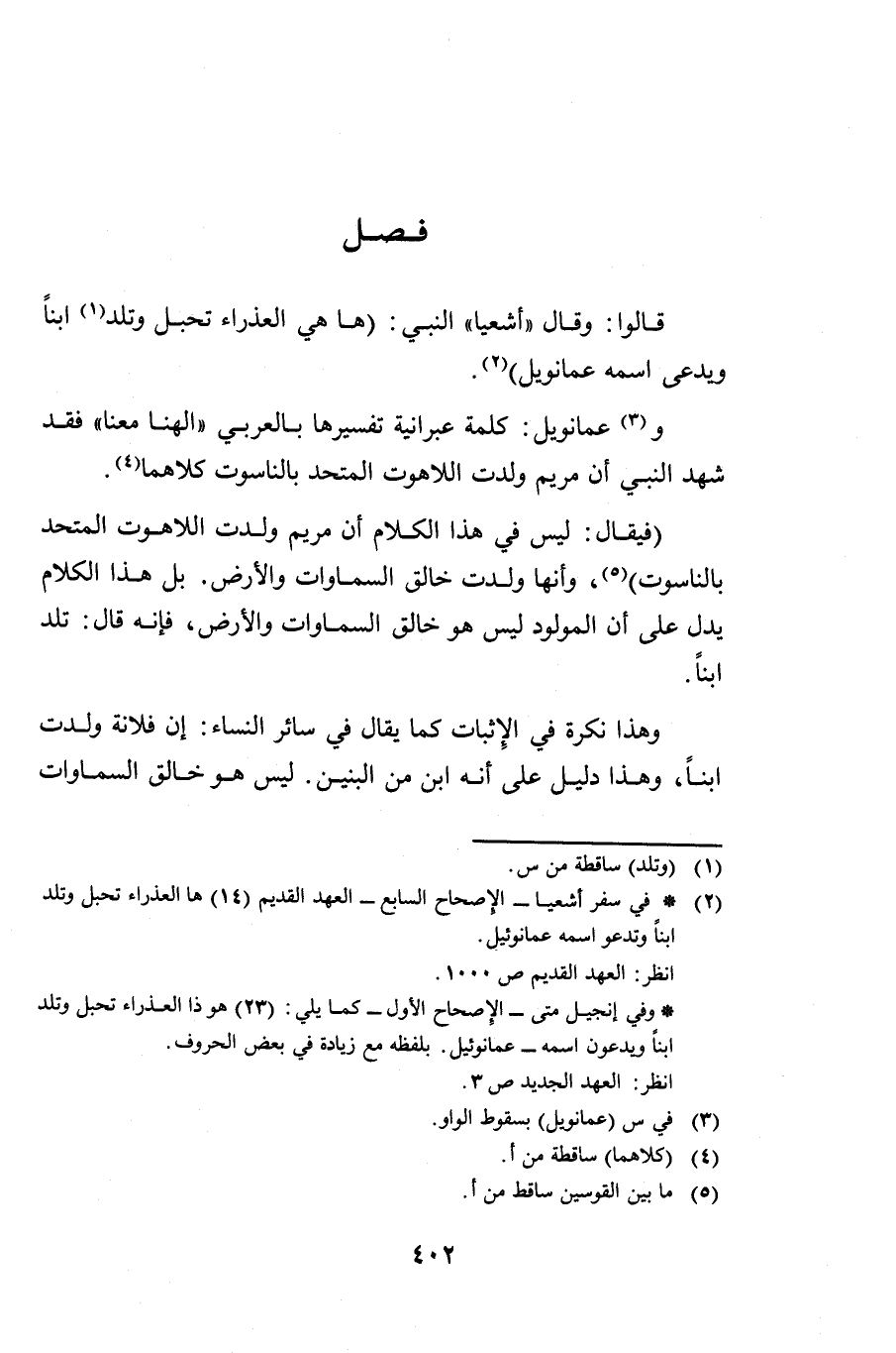 [فَصْلٌ: قَوْلُ أَشْعِيَا النَّبِيِّ هَا هِيَ الْعَذْرَاءُ تَحْبَلُ وَتَلِدُ ابْنًا وَيُدْعَى اسْمُهُ عِمَّانُوِيلَ]