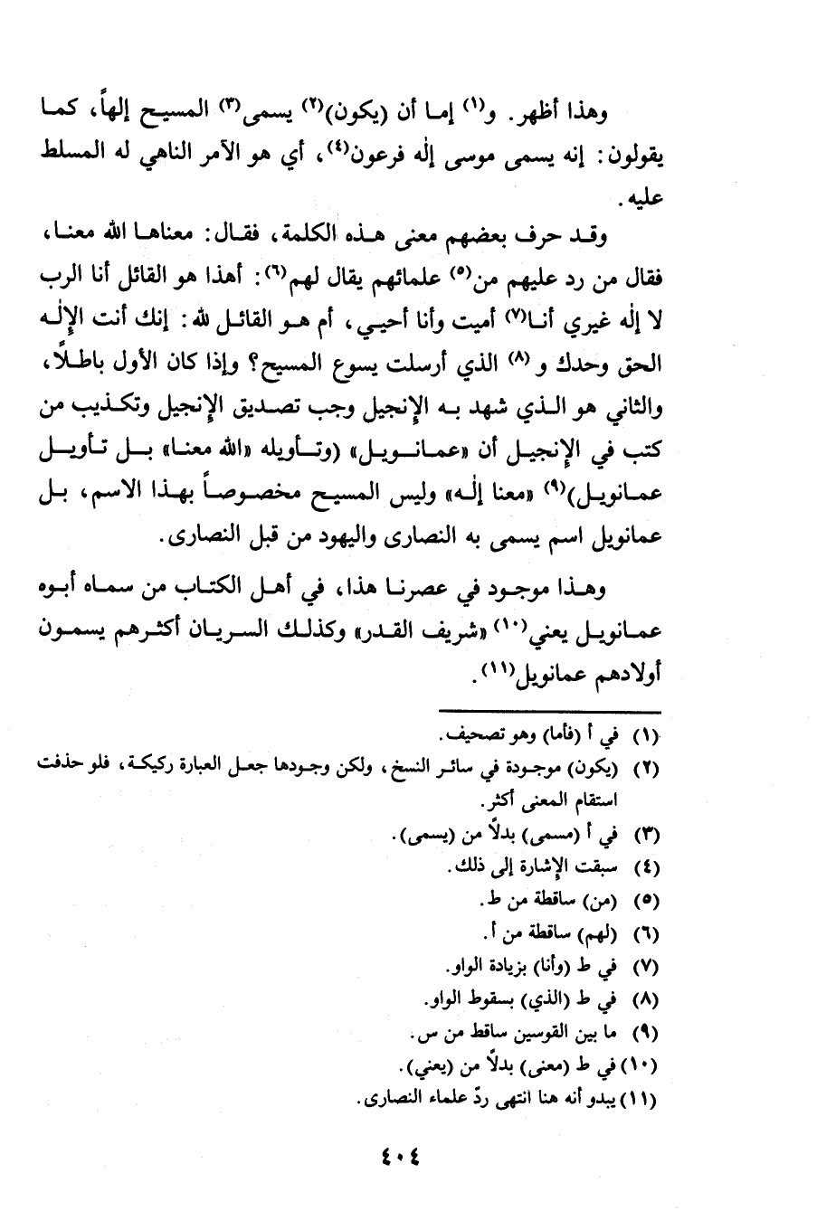 وَقَدْ حَرَّفَ بَعْضُهُمْ مَعْنَى هَذِهِ الْكَلِمَةِ، فَقَالَ: مَعْنَاهَا: اللَّهُ مَعَنَا، فَقَالَ: مَنْ رَدَّ عَلَيْهِمْ مِنْ عُلَمَائِهِمْ يُقَالُ لَهُم: أَهَذَا هُوَ الْقَائِلُ: أَنَا الرَّبُّ لَا إِلَهَ غَيْرِي، أَنَا أُمِيتُ وَأَنَا أُحْيِي، أَمْ هُوَ الْقَائِلُ لِلَّهِ: إِنَّكَ أَنْتَ الْإِلَهُ الْحَقُّ وَحْدَكَ وَالَّذِي أَرْسَلْتَ يَسُوعَ الْمَسِيحَ؟ وَإِذَا كَانَ الْأَوَّلُ بَاطِلًا، وَالثَّانِي هُوَ الَّذِي شَهِدَ بِهِ الْإِنْجِيلُ، وَجَبَ تَصْدِيقُ الْإِنْجِيلِ، وَتَكْذِيبُ مَنْ كَتَبَ فِي الْإِنْجِيلِ أَنَّ (عِمَّانُوِيلَ) وَتَأْوِيلَهُ - (اللَّهُ مَعَنَا) ، بَلْ تَأْوِيلُ عِمَّانُوِيلَ (مَعَنَا إِلَهٌ) ، وَلَيْسَ الْمَسِيحُ مَخْصُوصًا بِهَذَا الِاسْمِ، بَلْ عِمَّانُوِيلُ اسْمٌ يُسَمَّى بِهِ النَّصَارَى، وَالْيَهُودُ مِنْ قَبْلِ النَّصَارَى.