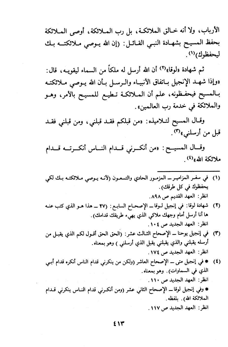 الْأَرْبَابِ، وَلَا أَنَّهُ خَالِقُ الْمَلَائِكَةِ، بَلْ رَبُّ الْمَلَائِكَةِ أَوْصَى الْمَلَائِكَةَ بِحِفْظِ الْمَسِيحِ بِشَهَادَةِ النَّبِيِّ الْقَائِلِ: (إِنَّ اللَّهَ يُوصِي مَلَائِكَتَهُ بِكَ لِيَحْفَظُوكَ) .