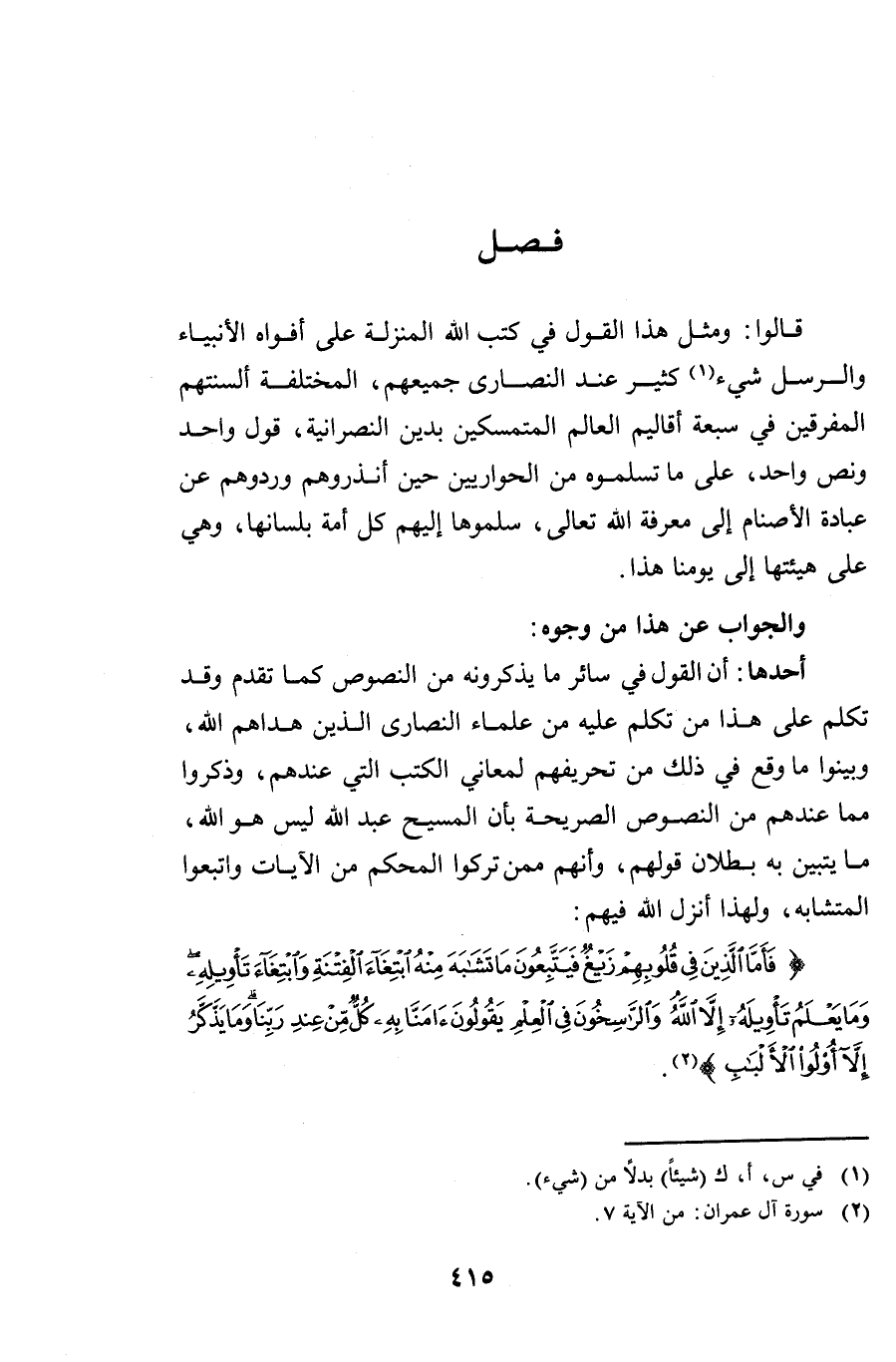 أَحَدُهَا: أَنَّ الْقَوْلَ فِي سَائِرِ مَا يَذْكُرُونَهُ مِنَ النُّصُوصِ كَمَا تَقَدَّمَ وَقَدْ تَكَلَّمَ عَلَى هَذَا مَنْ تَكَلَّمَ عَلَيْهِ مِنْ عُلَمَاءِ النَّصَارَى الَّذِينَ هَدَاهُمُ اللَّهُ، وَبَيَّنُوا مَا وَقَعَ فِي ذَلِكَ مِنْ تَحْرِيفِهِمْ لِمَعَانِي الْكُتُبِ الَّتِي عِنْدَهُم، وَذَكَرُوا مِمَّا عِنْدَهُمْ مِنَ النُّصُوصِ الصَّرِيحَةِ بِأَنَّ الْمَسِيحَ عَبْدُ اللَّهِ لَيْسَ هُوَ اللَّهَ - مَا يَتَبَيَّنُ بِهِ بُطْلَانُ قَوْلِهِم، وَأَنَّهُمْ مِمَّنْ تَرَكُوا الْمُحْكَمَ مِنَ الْآيَاتِ وَاتَّبَعُوا الْمُتَشَابِهَ، وَلِهَذَا أَنْزَلَ اللَّهُ فِيهِم: