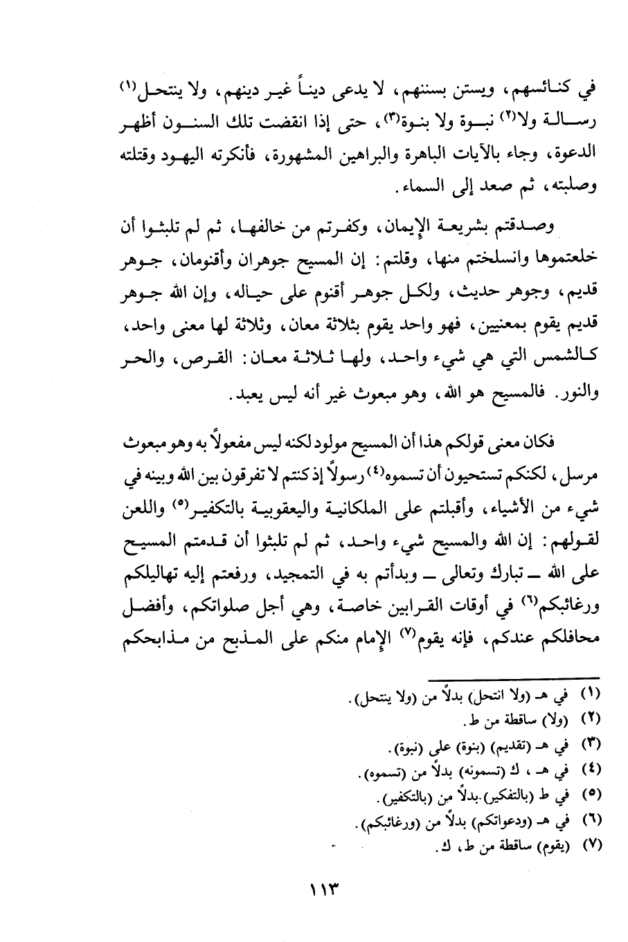 وَصَدَّقْتُمْ بِشَرِيعَةِ الْإِيمَانِ وَكَفَّرْتُمْ مَنْ خَالَفَهَا، ثُمَّ لَمْ تَلْبَثُوا أَنْ خَلَعْتُمُوهَا وَانْسَلَخْتُمْ مِنْهَا وَقُلْتُمْ: إِنَّ الْمَسِيحَ جَوْهَرَانِ وَأُقْنُومَانِ، جَوْهَرٌ قَدِيمٌ وَجَوْهَرٌ حَدِيثٌ، وَلِكُلِّ جَوْهَرٍ أُقْنُومٌ عَلَى حِيَالِهِ، وَإِنَّ اللَّهَ جَوْهَرٌ قَدِيمٌ يَقُومُ بِمَعْنَيَيْنِ، فَهُوَ وَاحِدٌ يَقُومُ بِثَلَاثَةِ مَعَانٍ، وَثَلَاثَةٌ لَهَا مَعْنًى وَاحِدٌ، كَالشَّمْسِ الَّتِي هِيَ شَيْءٌ وَاحِدٌ وَلَهَا ثَلَاثَةُ مَعَانٍ: الْقُرْصُ وَالْحَرُّ وَالنُّورُ. فَالْمَسِيحُ هُوَ اللَّهُ، وَهُوَ مَبْعُوثٌ غَيْرَ أَنَّهُ لَيْسَ يُعْبَدُ.