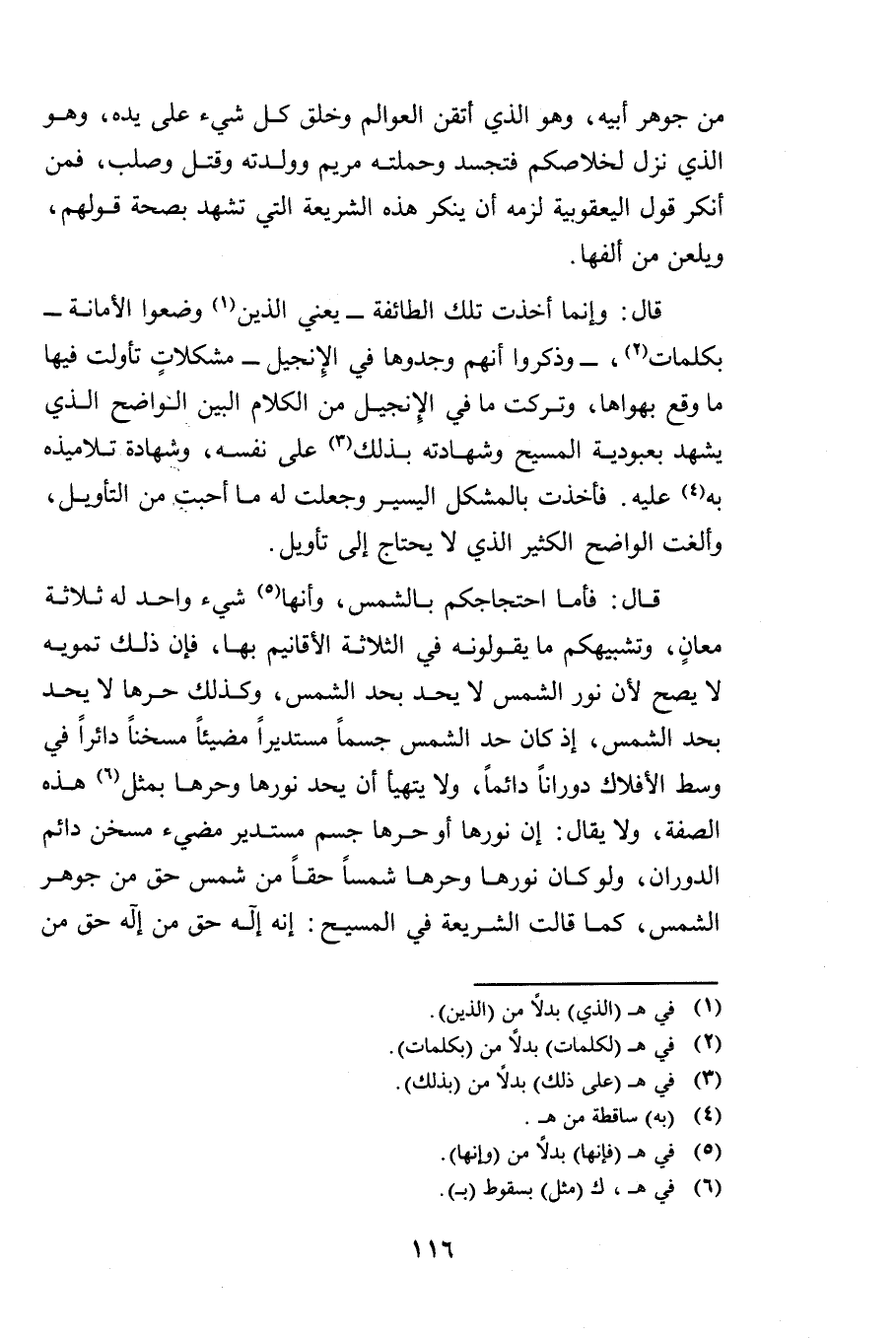 قَالَ: فَأَمَّا احْتِجَاجُكُمْ بِالشَّمْسِ، وَأَنَّهَا شَيْءٌ وَاحِدٌ لَهُ ثَلَاثَةُ مَعَانٍ، وَتَشْبِيهُكُمْ مَا يَقُولُونَهُ فِي الثَّلَاثَةِ الْأَقَانِيمِ بِهَا، فَإِنَّ ذَلِكَ تَمْوِيهٌ لَا يَصِحُّ، لِأَنَّ نُورَ الشَّمْسِ لَا يُحَدُّ بِحَدِّ الشَّمْسِ، وَكَذَلِكَ حَرُّهَا لَا يُحَدُّ بِحَدِّ الشَّمْسِ، إِذْ كَانَ حَدُّ الشَّمْسِ جِسْمًا مُسْتَدِيرًا مُضِيئًا مُسَخَّنًا دَائِرًا فِي وَسَطِ الْأَفْلَاكِ دَوَرَانًا دَائِمًا، وَيَتَهَيَّأُ أَنْ يُحَدَّ نُورُهَا وَحَرُّهَا بِمِثْلِ هَذِهِ الصِّفَةِ، وَلَا يُقَالُ: إِنَّ نُورَهَا أَوْ حَرَّهَا جِسْمٌ مُسْتَدِيرٌ مُضِيءٌ مُسَخَّنٌ دَائِمُ الدَّوَرَانِ، وَلَوْ كَانَ نُورُهَا وَحَرُّهَا شَمْسًا حَقًّا مِنْ شَمْسٍ حَقٍّ مِنْ جَوْهَرِ الشَّمْسِ، كَمَا قَالَتِ الشَّرِيعَةُ فِي الْمَسِيحِ: إِنَّهُ إِلَهٌ حَقٌّ مِنْ إِلَهٍ حَقٍّ مِنْ