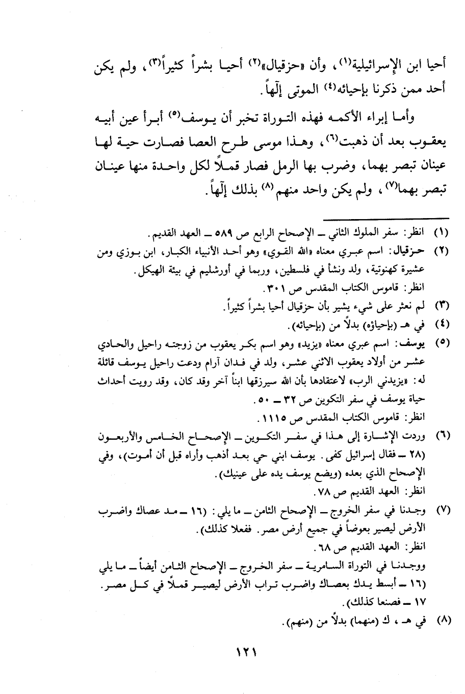 أَحْيَا ابْنَ الْإِسْرَائِيلِيَّةِ، وَأَنَّ " حِزْقِيَالَ " أَحْيَا بَشَرًا كَثِيرًا، وَلَمْ يَكُنْ أَحَدٌ مِمَنْ ذَكَرْنَا بِإِحْيَائِهِ الْمَوْتَى إِلَهًا.