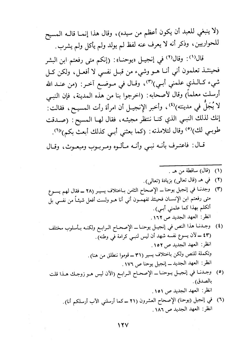 (لَا يَنْبَغِي لِلْعَبْدِ أَنْ يَكُونَ أَعْظَمَ مِنْ سَيِّدِهِ) . وَقَالَ: هَذَا إِنَّمَا قَالَهُ الْمَسِيحُ لِلْحِوَارِيِّينَ، وَذَكَرَ أَنَّهُ لَا يُعْرَفُ عَنْهُ لَفْظُ (لَمْ يُولَدْ، وَلَمْ يَأْكُلْ وَلَمْ يَشْرَبْ) .