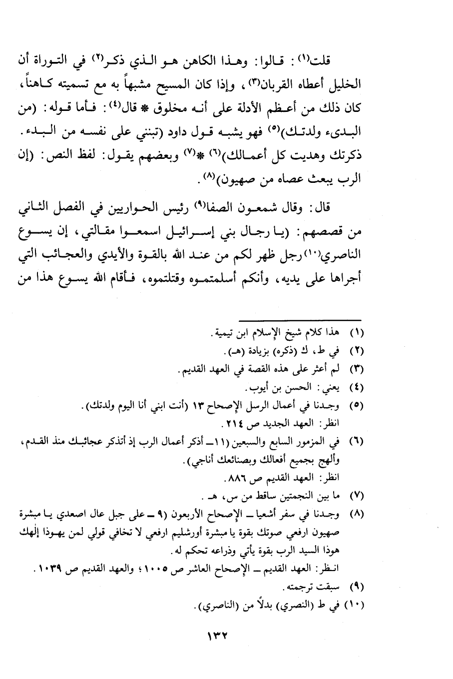 قُلْتُ: قَالُوا: وَهَذَا الْكَاهِنُ هُوَ الَّذِي ذُكِرَ فِي التَّوْرَاةِ أَنَّ الْخَلِيلَ أَعْطَاهُ الْقُرْبَانَ، وَإِذَا كَانَ الْمَسِيحُ مُشَبَّهًا بِهِ مَعَ تَسْمِيَتِهِ كَاهِنًا، كَانَ ذَلِكَ مِنْ أَعْظَمِ الْأَدِلَّةِ عَلَى أَنَّهُ مَخْلُوقٌ، قَالَ: فَأَمَّا قَوْلُهُ: (مِنَ الْبَدْءِ وَلَدْتُكَ) ، فَهُوَ يُشْبِهُ قَوْلَ دَاوُدَ: (تَبَنَّنِي عَلَى نَفْسِهِ مِنَ الْبَدْءِ. ذَكَرْتُكَ وَهَدَيْتُ كُلَّ أَعْمَالِكَ) . وَبَعْضُهُمْ يَقُولُ: لَفْظُ النَّصِّ: (إِنَّ الرَّبَّ يَبْعَثُ عَصَاهُ مِنْ صِهْيُونَ) .