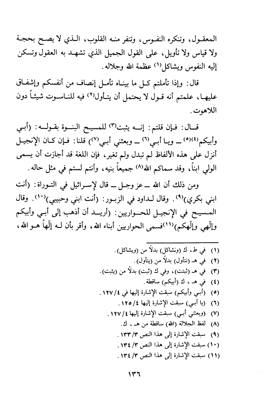 قَالَ: فَإِنْ قُلْتُمْ: إِنَّهُ يَثْبُتُ لِلْمَسِيحِ الْبُنُوَّةَ بِقَوْلِهِ: (أَبِي وَأَبِيكُمْ، وَيَا أَبِي، وَبَعَثَنِي أَبِي) . قُلْنَا: فَإِنْ كَانَ الْإِنْجِيلُ أُنْزِلَ عَلَى هَذِهِ الْأَلْفَاظِ لَمْ تُبَدَّلْ وَلَمْ تُغَيَّرْ، فَإِنَّ اللُّغَةَ قَدْ أَجَازَتْ أَنْ يُسَمَّى الْوَلِيُّ ابْنًا، وَقَدْ سَمَّاكُمُ اللَّهُ جَمِيعًا بَنِيهِ، وَأَنْتُمْ لَسْتُمْ فِي مِثْلِ حَالِهِ.