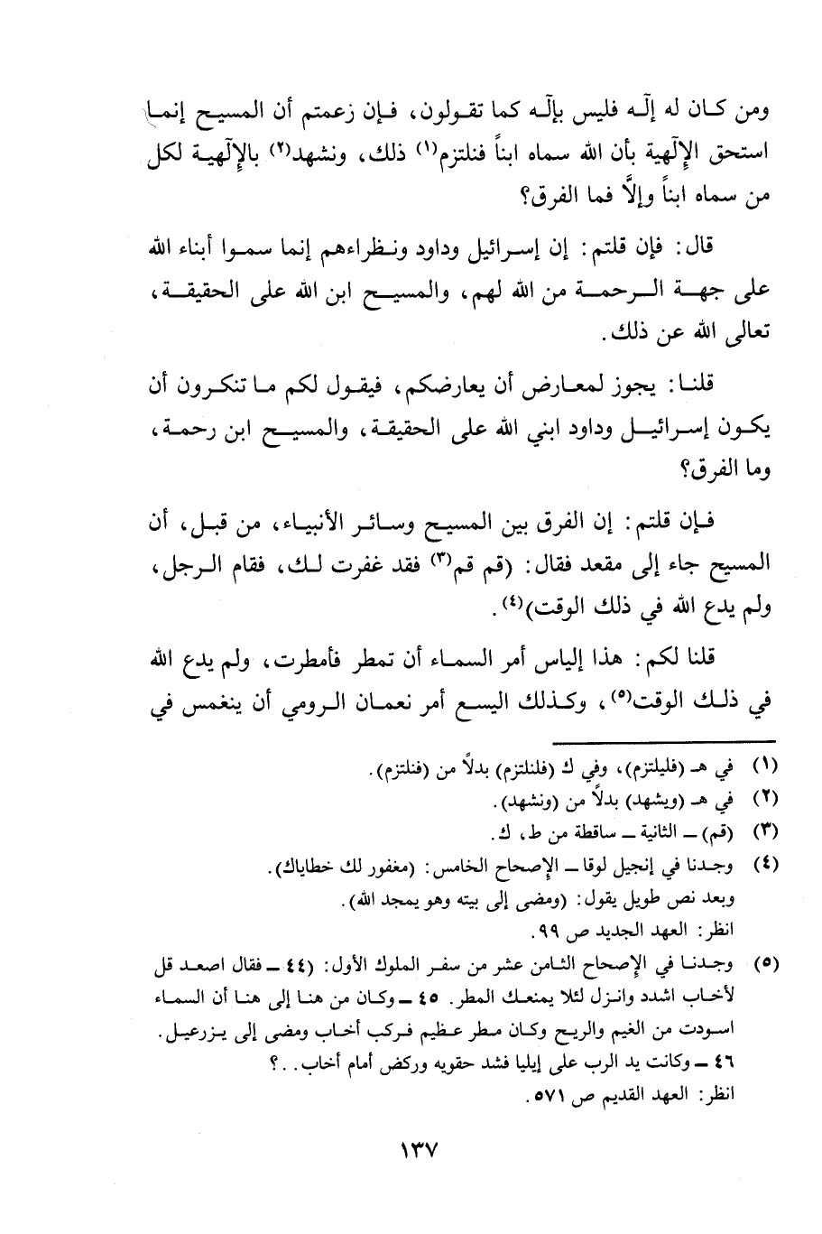 وَمَنْ كَانَ لَهُ إِلَهٌ فَلَيْسَ بِإِلَهٍ كَمَا تَقُولُونَ، فَإِنْ زَعَمْتُمْ أَنَّ الْمَسِيحَ إِنَّمَا اسْتَحَقَّ الْإِلَهِيَّةَ بِأَنَّ اللَّهَ سَمَّاهُ ابْنًا، فَنَلْتَزِمُ ذَلِكَ وَنَشْهَدُ بِالْإِلَهِيَّةِ لِكُلِّ مَنْ سَمَّاهُ ابْنًا، وَإِلَّا فَمَا الْفَرْقُ؟