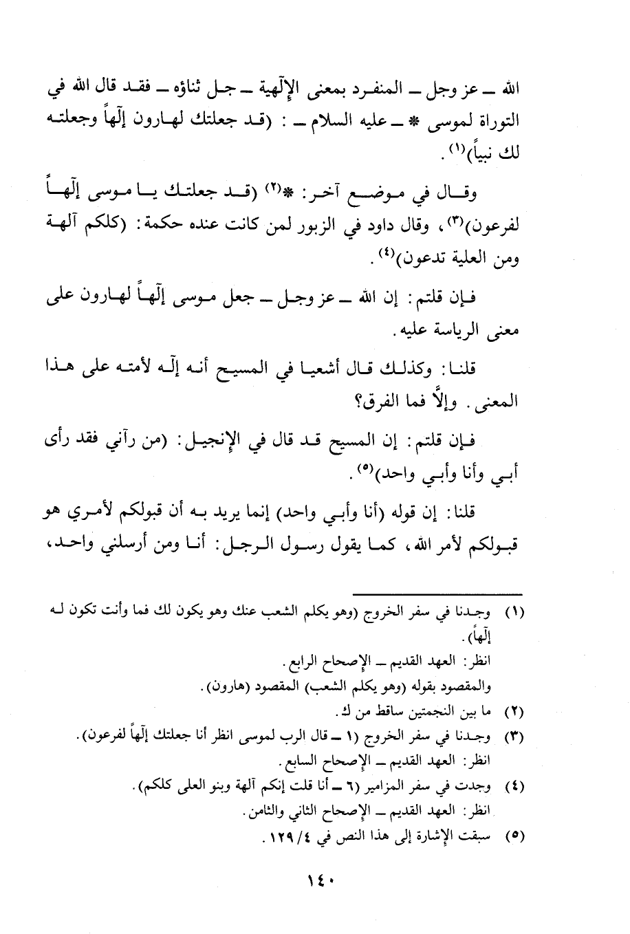اللَّهُ عَزَّ وَجَلَّ الْمُنْفَرِدَ بِمَعْنَى الْإِلَهِيَّةِ جَلَّ ثَنَاؤُهُ فَقَدْ قَالَ اللَّهُ فِي التَّوْرَاةِ لِمُوسَى عَلَيْهِ السَّلَامُ: (قَدْ جَعَلْتُكَ لِهَارُونَ إِلَهًا، وَجَعَلْتُهُ لَكَ نَبِيًّا) .