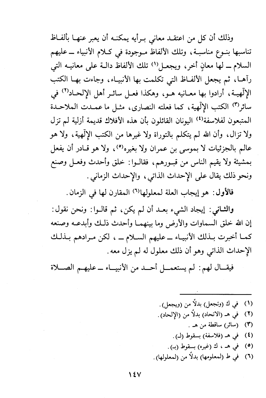 وَذَلِكَ أَنَّ كُلَّ مَنِ اعْتَقَدَ مَعَانِيَ بِرَأْيِهِ يُمْكِنُهُ أَنْ يُعَبِّرَ عَنْهَا بِأَلْفَاظٍ تُنَاسِبُهَا بِنَوْعِ مُنَاسَبَةٍ، وَتِلْكَ الْأَلْفَاظُ مَوْجُودَةٌ فِي كَلَامِ الْأَنْبِيَاءِ عَلَيْهِمُ السَّلَامُ لَهَا مَعَانٍ أُخَرَ، وَيَجْعَلَ تِلْكَ الْأَلْفَاظَ دَالَّةً عَلَى مَعَانِيهِ الَّتِي رَآهَا، ثُمَّ يَجْعَلَ الْأَلْفَاظَ الَّتِي تَكَلَّمَتْ بِهَا الْأَنْبِيَاءُ وَجَاءَتْ بِهَا الْكُتُبُ الْإِلَهِيَّةُ أَرَادُوا بِهَا مَعَانِيهِ هُوَ، وَهَكَذَا فَعَلَ سَائِرُ أَهْلِ الْإِلْحَادِ فِي سَائِرِ الْكُتُبِ الْإِلَهِيَّةِ، كَمَا فَعَلَتْهُ النَّصَارَى مِثْلَ مَا عَمَدَتِ الْمَلَاحِدَةُ الْمُتَّبِعُونَ لِفَلَاسِفَةِ الْيُونَانَ الْقَائِلُونَ بِأَنَّ هَذِهِ الْأَفْلَاكَ قَدِيمَةٌ أَزَلِيَّةٌ لَمْ تَزَلْ وَلَا تَزَالُ، وَأَنَّ اللَّهَ لَمْ يَتَكَلَّمْ بِالتَّوْرَاةِ وَلَا غَيْرِهَا مِنَ الْكُتُبِ الْإِلَهِيَّةِ، وَلَا هُوَ عَالِمٌ بِالْجُزْئِيَّاتِ لَا بِمُوسَى بْنِ عِمْرَانَ وَلَا بِغَيْرِهِ، وَلَا هُوَ قَادِرٌ أَنْ يَفْعَلَ بِمَشِيئَةٍ، وَلَا يُقِيمُ النَّاسَ مِنْ قُبُورِهِمْ، فَقَالُوا: خَلَقَ وَأَحْدَثَ وَفَعَلَ وَصَنَعَ وَنَحْوَ ذَلِكَ يُقَالُ عَلَى الْإِحْدَاثِ الذَّاتِيِّ، وَالْإِحْدَاثِ الزَّمَانِيِّ.
