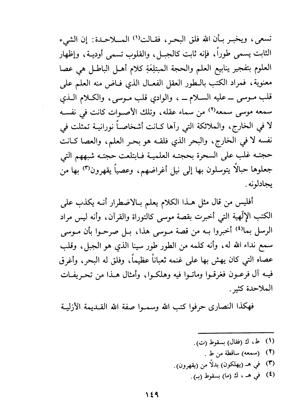 تَسْعَى، وَيُخْبِرُ بِأَنَّ اللَّهَ فَلَقَ الْبَحْرَ، فَقَالَتِ الْمَلَاحِدَةُ: إِنَّ الشَّيْءَ الثَّابِتَ يُسَمَّى طُورًا، فَإِنَّهُ ثَابِتٌ كَالْجَبَلِ، وَالْقُلُوبَ تُسَمَّى أَوْدِيَةً، وَإِظْهَارَ الْعُلُومِ بِتَفْجِيرِ يَنَابِيعِ الْعِلْمِ، وَالْحُجَّةَ الْمُبْتَلِعَةَ كَلَامَ أَهْلِ الْبَاطِلِ هِيَ عَصًا مَعْنَوِيَّةٌ، فَمُرَادُ الْكُتُبِ بِالطُّورِ الْعَقْلُ الْفَعَّالُ الَّذِي فَاضَ مِنْهُ الْعِلْمُ عَلَى قَلْبِ مُوسَى عَلَيْهِ السَّلَامُ، وَالْوَادِي قَلْبُ مُوسَى، وَالْكَلَامُ الَّذِي سَمِعَهُ مُوسَى سَمِعَهُ مِنْ سَمَاءِ عَقْلِهِ، وَتِلْكَ الْأَصْوَاتُ كَانَتْ فِي نَفْسِهِ لَا فِي الْخَارِجِ، وَالْمَلَائِكَةُ الَّتِي رَآهَا كَانَتْ أَشْخَاصًا نُورَانِيَّةً تَمَثَّلَتْ فِي نَفْسِهِ لَا فِي الْخَارِجِ، وَالْبَحْرُ الَّذِي فَلَقَهُ هُوَ بَحْرُ الْعِلْمِ، وَالْعَصَا كَانَتْ حُجَّتَهُ، غَلَبَ عَلَى السَّحَرَةِ بِحُجَّتِهِ الْعِلْمِيَّةِ فَابْتَلَعَتْ حُجَّتُهُ شُبَهَهُمُ الَّتِي جَعَلُوهَا حِبَالًا يَتَوَسَّلُونَ بِهَا إِلَى نَيْلِ أَغْرَاضِهِمْ، وَعِصِيًّا يَقْهَرُونَ بِهَا مَنْ يُجَادِلُونَهُ.