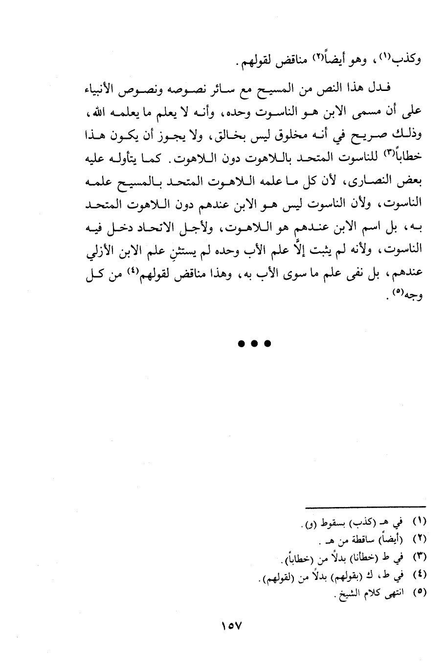 فَدَلَّ هَذَا النَّصُّ مِنَ الْمَسِيحِ مَعَ سَائِرِ نُصُوصِهِ وَنُصُوصِ الْأَنْبِيَاءِ عَلَى أَنَّ مُسَمَّى الِابْنِ هُوَ النَّاسُوتُ وَحْدَهُ، وَأَنَّهُ لَا يَعْلَمُ مَا يَعْلَمُهُ اللَّهُ، وَذَلِكَ صَرِيحٌ فِي أَنَّهُ مَخْلُوقٌ لَيْسَ بِخَالِقٍ، وَلَا يَجُوزُ أَنْ يَكُونَ هَذَا خِطَابًا لِلنَّاسُوتِ الْمُتَّحِدِ بِاللَّاهُوتِ دُونَ اللَّاهُوتِ، كَمَا يَتَأَوَّلُهُ عَلَيْهِ بَعْضُ النَّصَارَى، لِأَنَّ كُلَّ مَا عَلِمَهُ اللَّاهُوتُ الْمُتَّحِدُ بِالْمَسِيحِ عَلِمَهُ النَّاسُوتُ، وَلِأَنَّ النَّاسُوتَ لَيْسَ هُوَ الِابْنُ عِنْدَهُمْ دُونَ اللَّاهُوتِ الْمُتَّحِدِ بِهِ، بَلِ اسْمُ الِابْنِ عِنْدَهُمْ هُوَ اللَّاهُوتُ، وَلِأَجْلِ الِاتِّحَادِ دَخَلَ فِيهِ النَّاسُوتُ، وَلِأَنَّهُ لَمْ يُثْبِتْ إِلَّا عِلْمَ الْأَبِ وَحْدَهُ لَمْ يَسْتَثْنِ عِلْمَ الِابْنِ الْأَزَلِيَّ عِنْدَهُمْ، بَلْ نَفَى عِلْمَ مَا سِوَى الْأَبِ بِهِ، وَهَذَا مُنَاقِضٌ لِقَوْلِهِمْ مِنْ كُلِّ وَجْهٍ.