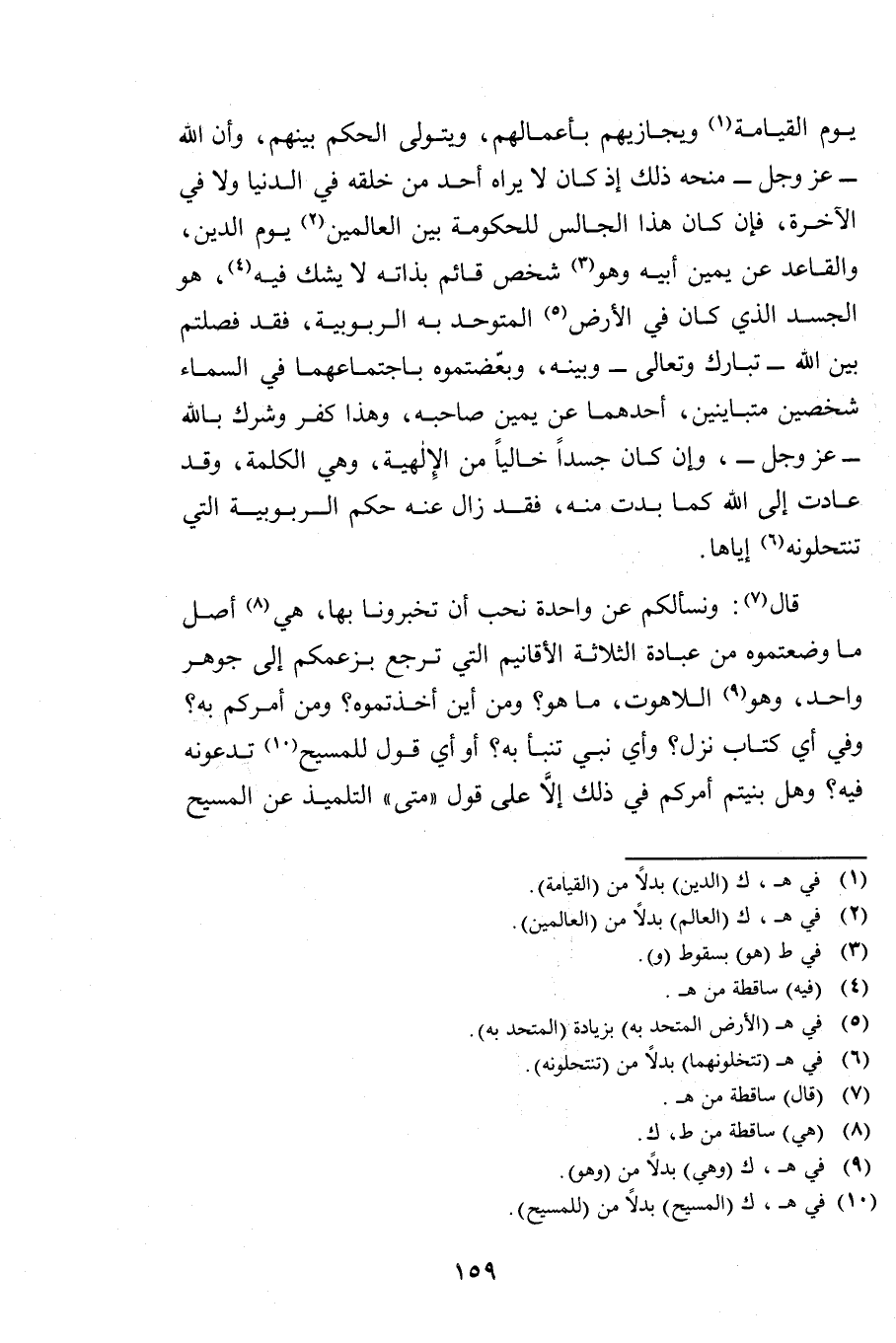 قَالَ: وَنَسْأَلُكُمْ عَنْ وَاحِدَةٍ نُحِبُّ أَنْ تُخْبِرُونَا بِهَا، هِيَ أَصْلُ مَا وَضَعْتُمُوهُ مِنْ عِبَادَةِ الثَّلَاثَةِ الْأَقَانِيمِ الَّتِي تَرْجِعُ بِزَعْمِكُمْ إِلَى جَوْهَرٍ وَاحِدٍ وَهُوَ اللَّاهُوتُ، مَا هُوَ؟ وَمِنْ أَيْنَ أَخَذْتُمُوهُ؟ وَمَنْ أَمَرَكُمْ بِهِ؟ وَفِي أَيِّ كِتَابٍ نَزَلَ؟ وَأَيُّ نَبِيٍّ تَنَبَّأَ بِهِ؟ أَوْ أَيُّ قَوْلٍ لِلْمَسِيحِ تَدَّعُونَهُ فِيهِ؟ وَهَلْ بَنَيْتُمْ أَمْرَكُمْ فِي ذَلِكَ إِلَّا عَلَى قَوْلِ " مَتَّى " التِّلْمِيذِ عَلَى الْمَسِيحِ