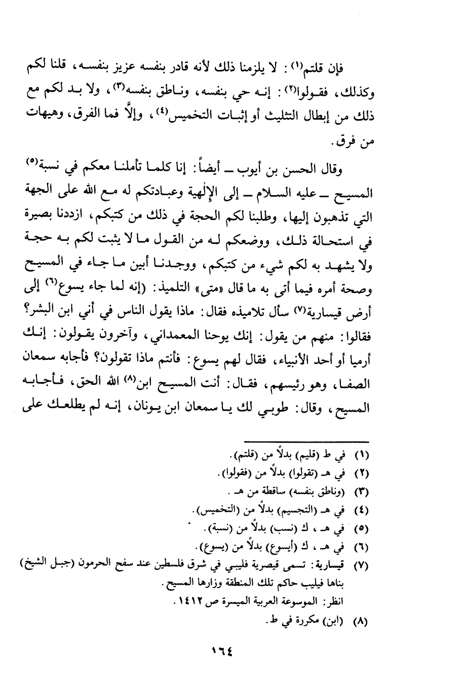 وَقَالَ الْحَسَنُ بْنُ أَيُّوبَ أَيْضًا: إِنَّا كُلَّمَا تَأَمَّلْنَا مَعَكُمْ فِي نِسْبَةِ الْمَسِيحِ عَلَيْهِ السَّلَامُ إِلَى الْإِلَهِيَّةِ وَعِبَادَتِكُمْ لَهُ مَعَ اللَّهِ عَلَى الْجِهَةِ الَّتِي تَذْهَبُونَ إِلَيْهَا، وَطَلَبْنَا لَكُمُ الْحُجَّةَ فِي ذَلِكَ مِنْ كُتُبِكُمْ، ازْدَدْنَا بَصِيرَةً فِي اسْتِحَالَةِ ذَلِكَ وَوَضْعِكُمْ لَهُ مِنَ الْقَوْلِ مَا يَثْبُتُ لَكُمْ بِهِ حُجَّةٌ، وَلَا يَشْهَدُ بِهِ لَكُمْ شَيْءٌ مِنْ كُتُبِكُمْ، وَوَجَدْنَا أَبْيَنَ مَا جَاءَ فِي الْمَسِيحِ وَصِحَّةِ أَمْرِهِ فِيمَا أَتَى بِهِ مَا قَالَ " مَتَّى " التِّلْمِيذُ: (إِنَّهُ لَمَّا جَاءَ يَسُوعُ إِلَى أَرْضِ قَيْسَارِيَّةَ سَأَلَ تَلَامِيذَهُ فَقَالَ: مَاذَا يَقُولُ النَّاسُ فِي أَنِّي ابْنُ الْبَشَرِ؟ فَقَالُوا: مِنْهُمْ مَنْ يَقُولُ: إِنَّكَ يُوحَنَّا الْمَعْمِدَانِيُّ، وَآخَرُونَ يَقُولُونَ: إِنَّكَ أَرْمِيَا، أَوْ أَحَدُ الْأَنْبِيَاءِ. فَقَالَ لَهُمْ يَسُوعُ: فَأَنْتُمْ مَاذَا تَقُولُونَ؟ فَأَجَابَهُ سَمْعَانُ الصَّفَا، وَهُوَ رَئِيسُهُمْ، فَقَالَ: أَنْتَ الْمَسِيحُ ابْنُ اللَّهِ الْحَقِّ. فَأَجَابَهُ الْمَسِيحُ وَقَالَ: طُوبَى لَكَ يَا سَمْعَانُ ابْنَ يُونَانَ، إِنَّهُ لَمْ يُطْلِعْكَ عَلَى