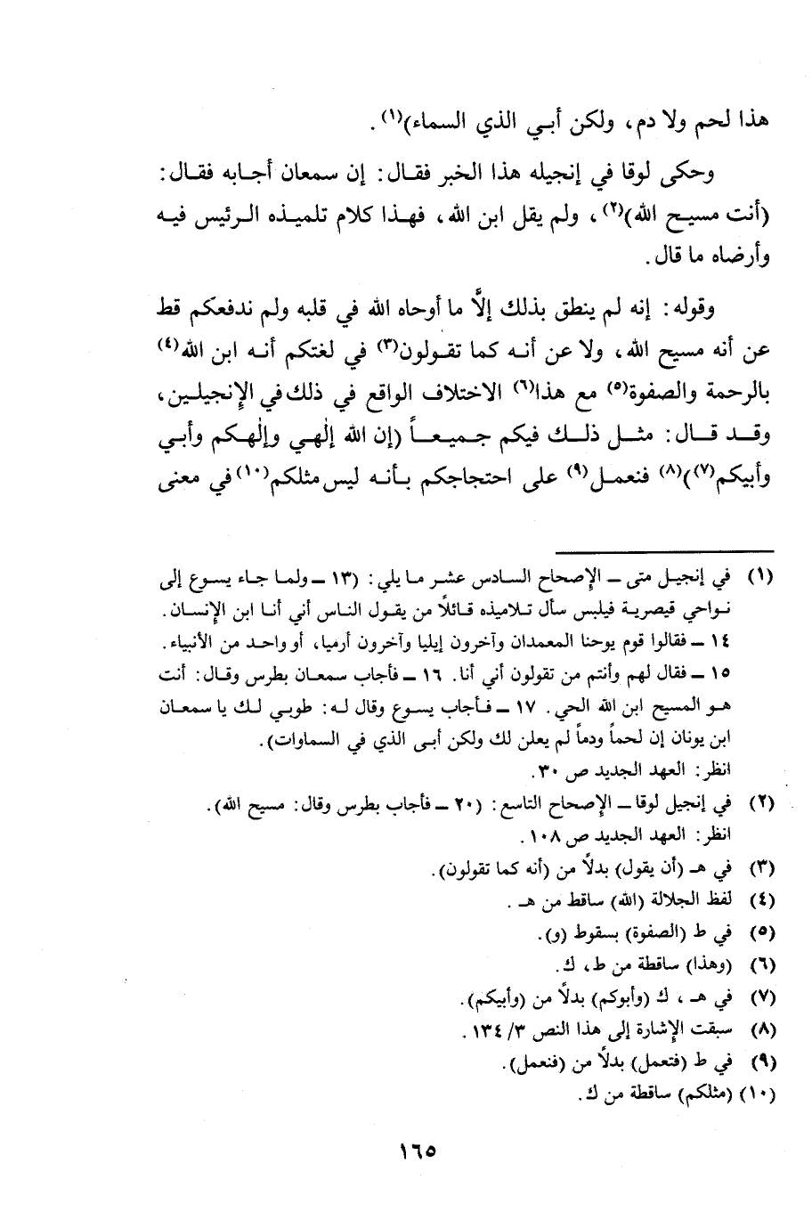 وَقَوْلُهُ: إِنَّهُ لَمْ يَنْطِقْ بِذَلِكَ إِلَّا مَا أَوْحَاهُ اللَّهُ فِي قَلْبِهِ وَلَمْ نَدْفَعْكُمْ قَطُّ عَنْ أَنَّهُ مَسِيحُ اللَّهِ، وَلَا عَنْ أَنَّهُ كَمَا تَقُولُونَ فِي لُغَتِكُمْ أَنَّهُ ابْنُ اللَّهِ بِالرَّحْمَةِ وَالصَّفْوَةِ مَعَ هَذَا الِاخْتِلَافِ الْوَاقِعِ فِي ذَلِكَ فِي الْإِنْجِيلَيْنِ، وَقَدْ قَالَ مِثْلَ ذَلِكَ فِيكُمْ جَمِيعًا: (إِنَّ اللَّهَ إِلَهِي وَإِلَهُكُمْ وَأَبِي وَأَبِيكُمْ) ، فَنَعْمَلُ عَلَى احْتِجَاجِكُمْ بِأَنَّهُ لَيْسَ مِثْلُكُمْ فِي مَعْنَى