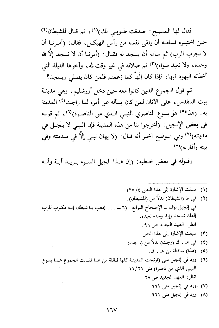فَقَالَ لَهَا الْمَسِيحُ: صَدَقْتِ طُوبَى لَكِ) ، ثُمَّ قَالَ لِلشَّيْطَانِ حِينَ اخْتَبَرَهُ فَسَامَهُ أَنْ يُلْقِيَ نَفْسَهُ مِنْ رَأَسِ الْهَيْكَلِ، فَقَالَ: (أُمِرْنَا أَنْ لَا نُجَرِّبَ الرَّبَّ) ، ثُمَّ سَامَهُ أَنْ يَسْجُدَ لَهُ فَقَالَ: (أُمِرْنَا أَنْ لَا نَسْجُدَ إِلَّا لِلَّهِ وَحْدَهُ، وَلَا نَعْبُدَ سِوَاهُ) ، ثُمَّ صَلَاتُهُ فِي غَيْرِ وَقْتٍ لِلَّهِ، وَآخِرُهَا اللَّيْلَةَ الَّتِي أَخَذَتْهُ الْيَهُودُ فِيهَا، فَإِذَا كَانَ إِلَهًا كَمَا زَعَمْتُمْ فَلِمَنْ كَانَ يُصَلِّي وَيَسْجُدُ؟