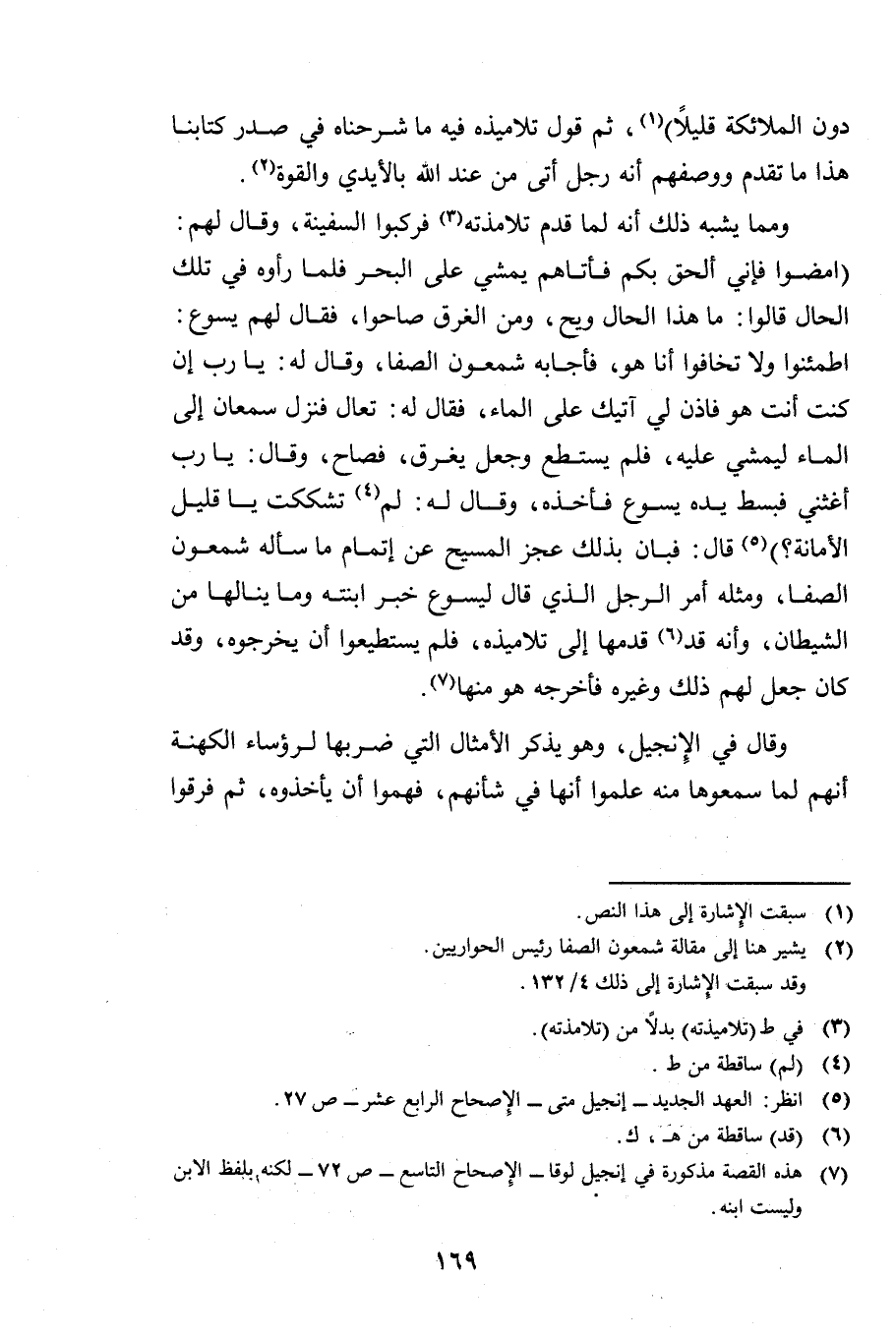 وَمِمَّا يُشْبِهُ ذَلِكَ أَنَّهُ لَمَّا قَدَّمَ تَلَامِذَتَهُ فَرَكِبُوا السَّفِينَةَ وَقَالَ لَهُمْ: (امْضُوا فَإِنِّي أَلْحَقُ بِكُمْ، فَأَتَاهُمْ يَمْشِي عَلَى الْبَحْرِ فَلَمَّا رَأَوْهُ فِي تِلْكَ الْحَالِ قَالُوا: مَا هَذَا الْحَالُ وَيْحٌ، وَمِنَ الْغَرَقِ صَاحُوا. فَقَالَ لَهُمْ يَسُوعُ: اطْمَئِنُّوا وَلَا تَخَافُوا أَنَا هُوَ، فَأَجَابَهُ شَمْعُونَ الصَّفَا وَقَالَ لَهُ: يَا رَبِّ إِنْ كُنْتَ أَنْتَ هُوَ فَأْذَنْ لِي آتِيكَ عَلَى الْمَاءِ. فَقَالَ لَهُ: تَعَالَ، فَنَزَلَ سَمْعَانُ إِلَى الْمَاءِ لِيَمْشِيَ عَلَيْهِ، فَلَمْ يَسْتَطِعْ وَجَعَلَ يَغْرَقُ، فَصَاحَ وَقَالَ: يَا رَبِّ أَغِثْنِي، فَبَسَطَ يَدَهُ يَسُوعُ فَأَخَذَهُ وَقَالَ لَهُ: لِمَ تَشَكَّكْتَ يَا قَلِيلَ الْأَمَانَةِ؟) . قَالَ: فَبَانَ بِذَلِكَ عَجْزُ الْمَسِيحِ عَنْ إِتْمَامِ مَا سَأَلَهُ شَمْعُونُ الصَّفَا، وَمِثْلُهُ أَمْرُ الرَّجُلِ الَّذِي قَالَ لِيَسُوعَ خَبَرَ ابْنَتِهِ وَمَا يَنَالُهَا مِنَ الشَّيْطَانِ، وَأَنَّهُ قَدْ قَدَّمَهَا إِلَى تَلَامِيذِهِ فَلَمْ يَسْتَطِيعُوا أَنْ يُخْرِجُوهُ، وَقَدْ كَانَ جَعَلَ لَهُمْ ذَلِكَ وَغَيْرَهُ فَأَخْرَجَهُ هُوَ مِنْهَا.