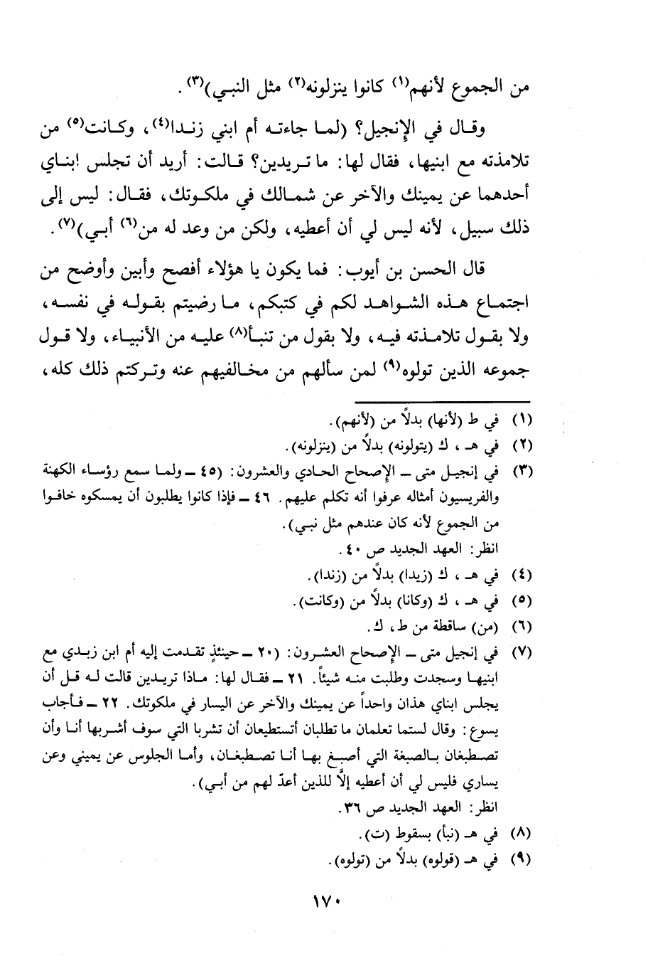 وَقَالَ فِي الْإِنْجِيلِ لَمَّا جَاءَتْهُ أُمُّ ابْنَيْ زِنْدَا، وَكَانَتْ مِنْ تَلَامِذَتِهِ مَعَ ابْنَيْهَا، فَقَالَ لَهَا: (مَا تُرِيدِينَ؟ قَالَتْ: أُرِيدُ أَنْ تُجْلِسَ ابْنَايَ أَحَدَهُمَا عَنْ يَمِينِكَ وَالْآخَرَ عَنْ شِمَالِكَ فِي مَلَكُوتِكَ. فَقَالَ: لَيْسَ إِلَى ذَلِكَ سَبِيلٌ، لِأَنَّهُ لَيْسَ لِي أَنْ أُعْطِيَهُ، وَلَكِنْ مَنْ وُعِدَ لَهُ مِنْ أَبِي) .