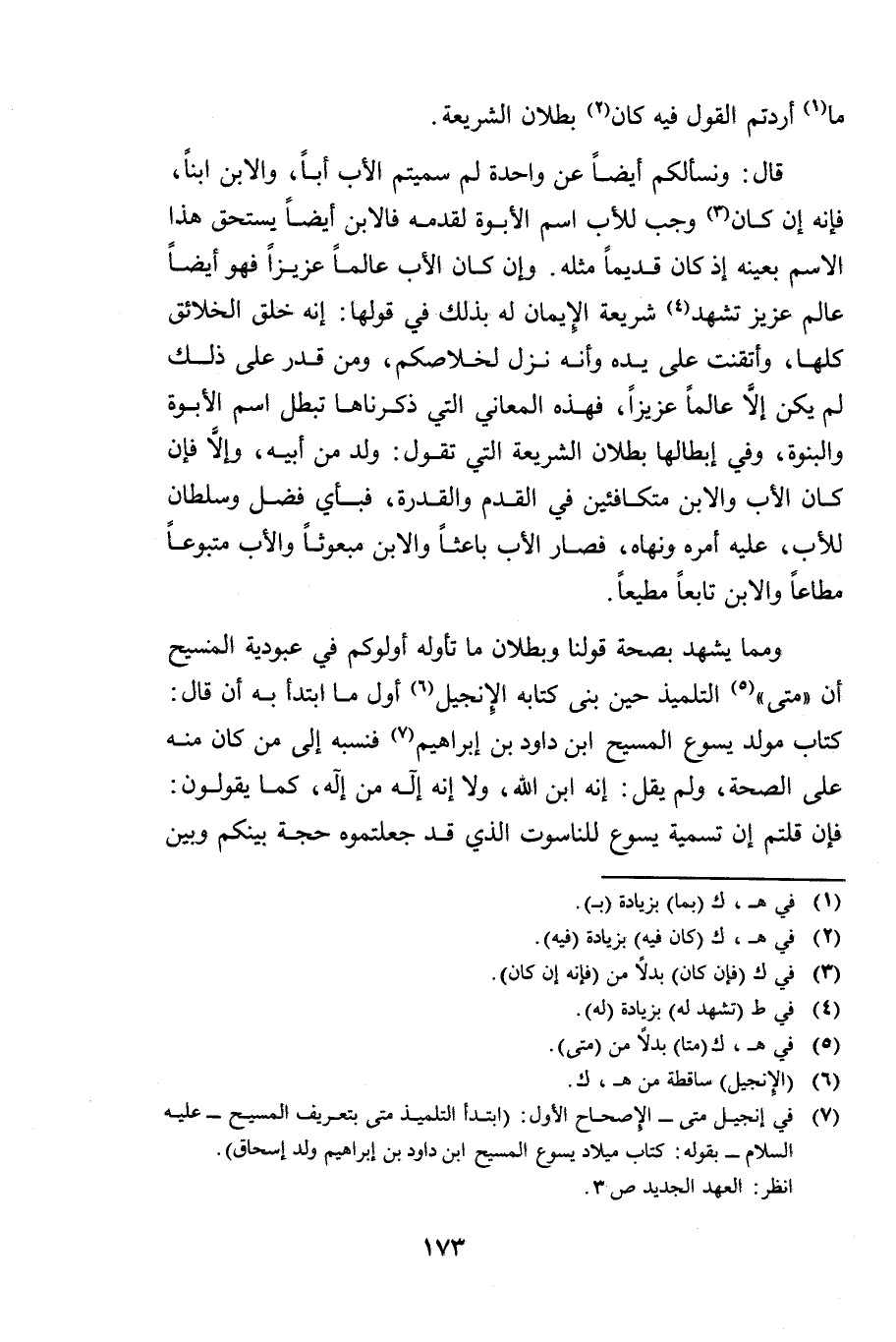 وَمِمَّا يَشْهَدُ بِصِحَّةِ قَوْلِنَا وَبُطْلَانِ مَا تَأَوَّلَهُ أَوَّلُوكُمْ فِي عُبُودِيَّةِ الْمَسِيحِ، أَنَّ " مَتَّى " التِّلْمِيذَ حِينَ بَنَى كِتَابَهُ الْإِنْجِيلَ أَوَّلَ مَا ابْتَدَأَ بِهِ أَنْ قَالَ: كِتَابُ مَوْلِدِ يَسُوعَ الْمَسِيحِ ابْنِ دَاوُدَ بْنِ إِبْرَاهِيمَ، فَنَسَبَهُ إِلَى مَنْ كَانَ مِنْهُ عَلَى الصِّحَّةِ، وَلَمْ يَقِلْ: إِنَّهُ ابْنُ اللَّهِ، وَلَا إِنَّهُ إِلَهٌ مِنْ إِلَهٍ كَمَا يَقُولُونَ: فَإِنْ قُلْتُمْ: إِنَّ تَسْمِيَةَ يَسُوعَ لِلنَّاسُوتِ الَّذِي قَدْ جَعَلْتُمُوهُ حُجَّةً بَيْنَكُمْ وَبَيْنَ